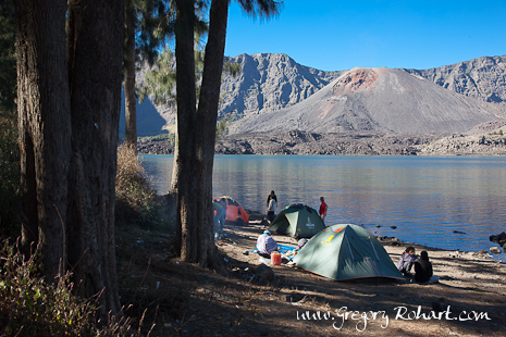 Nous avons donc bivouaqué sur le bord du lac au cœur de la caldeira du volcan Rinjani. De forme elliptique, elle est large de 6×7 km. Au centre de la caldeira, le lac Segara Anak et le cône du Gunung Baru semblent dormir paisiblement tandis qu'autour forêts et falaises escarpées dominent le paysage. La tranquillité du volcan est trompeuse. L'histoire le prouve.