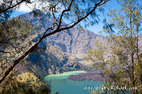 En prenant de la hauteur, le panorama sur le lac Segara Anak, le Gunung Baru et la cime du Rinjani est de toute beauté. On peut voir aisément sur la rive opposée du lac une eau brun-jaune très esthétique. C'est le signe précurseur d’un changement de l’activité du volcan comme le précise Benjamin Barbier dans sa thèse Bilan thermique et caractérisation géochimique de l’activité hydrothermale du volcan Rinjani (un peu technique mais très instructive). Est-ce dire qu'il y aura prochainement une éruption volcanique ?