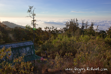 Depuis le bord du cratère au camp de Rim I, c'est un des plus beaux paysages qui m'ait été donné de voir que je suis entrain d'apprécier. Amazing landscape ! Pas mal de macaques dans les parages à la recherche de nourriture laissé sur les campements. L'un d'entre-eux, ayant repéré un reste de banane, se lèvera sur ses deux pattes arrière pour guetter d'éventuels congénères. Rien en vue, il pourra déguster sa banane sans devoir la partager.