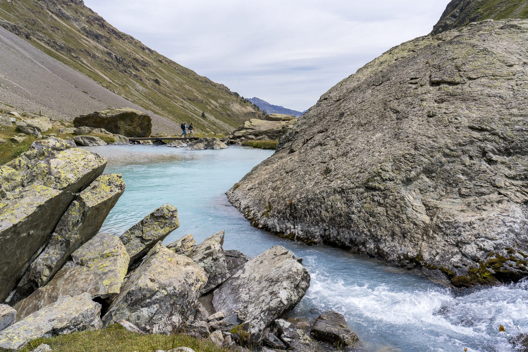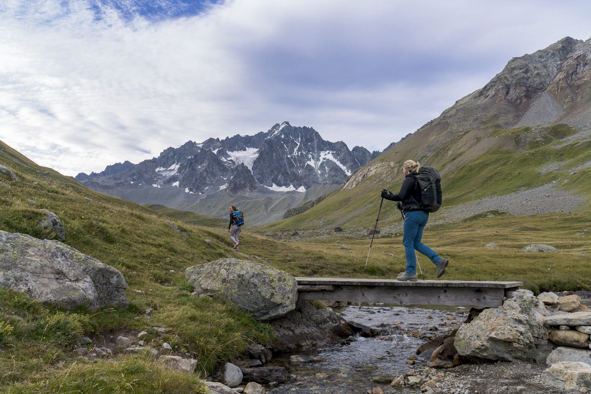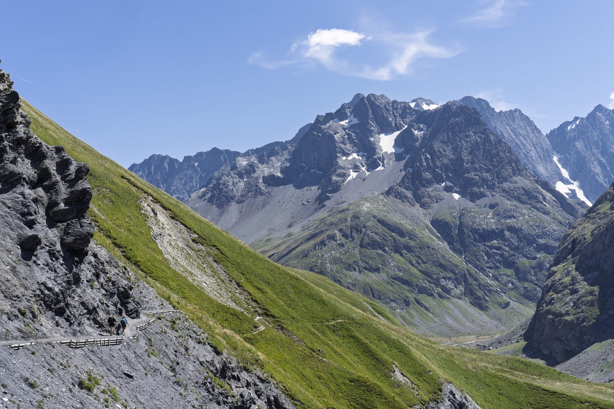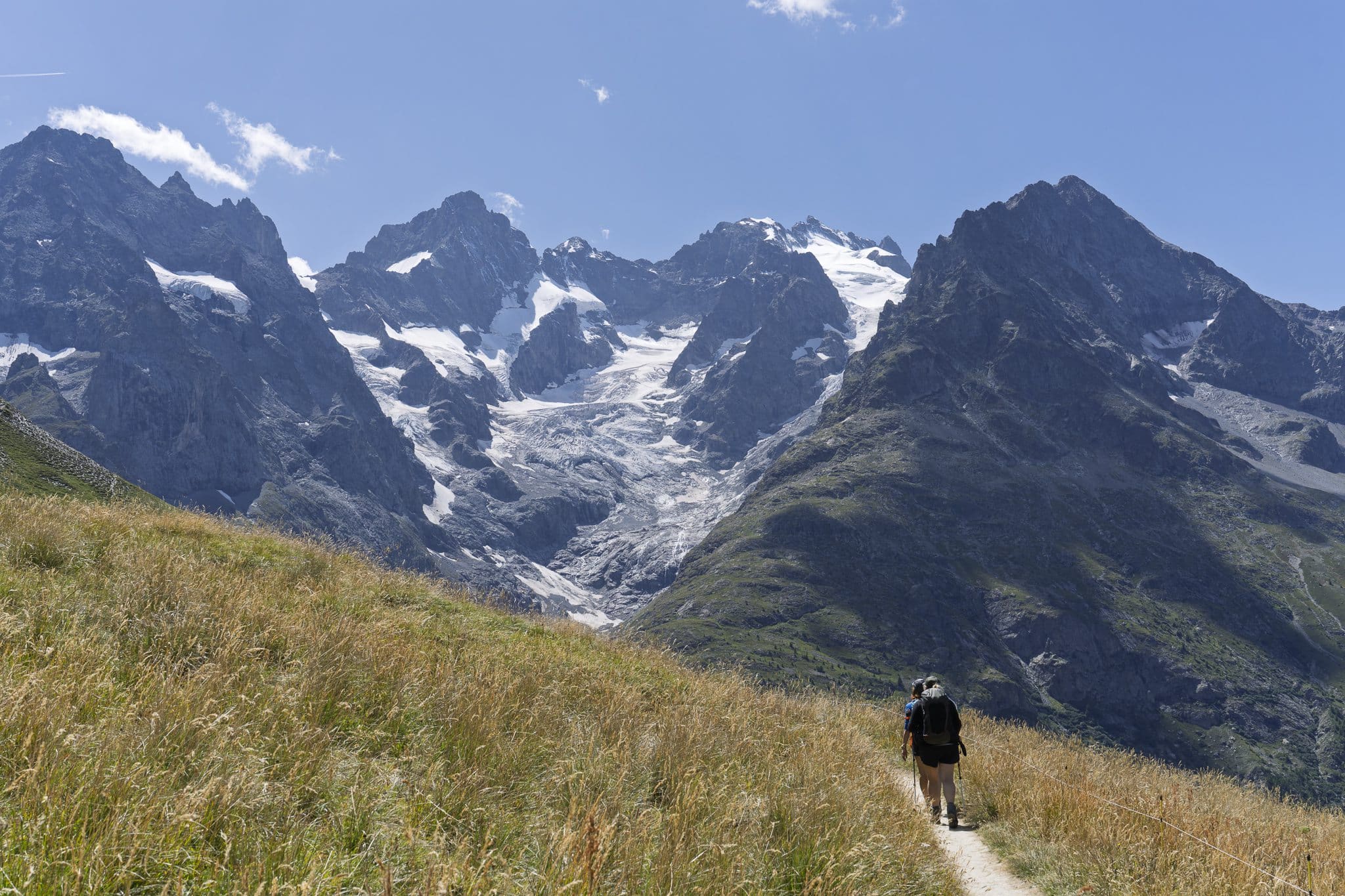 Après le passage du Rocher Blanc, nous surplombons la Romanche et voyons pour la première fois le glacier d'Arsine. Ici commence les prairies d'altitude où les marmottes ont élu domicile.