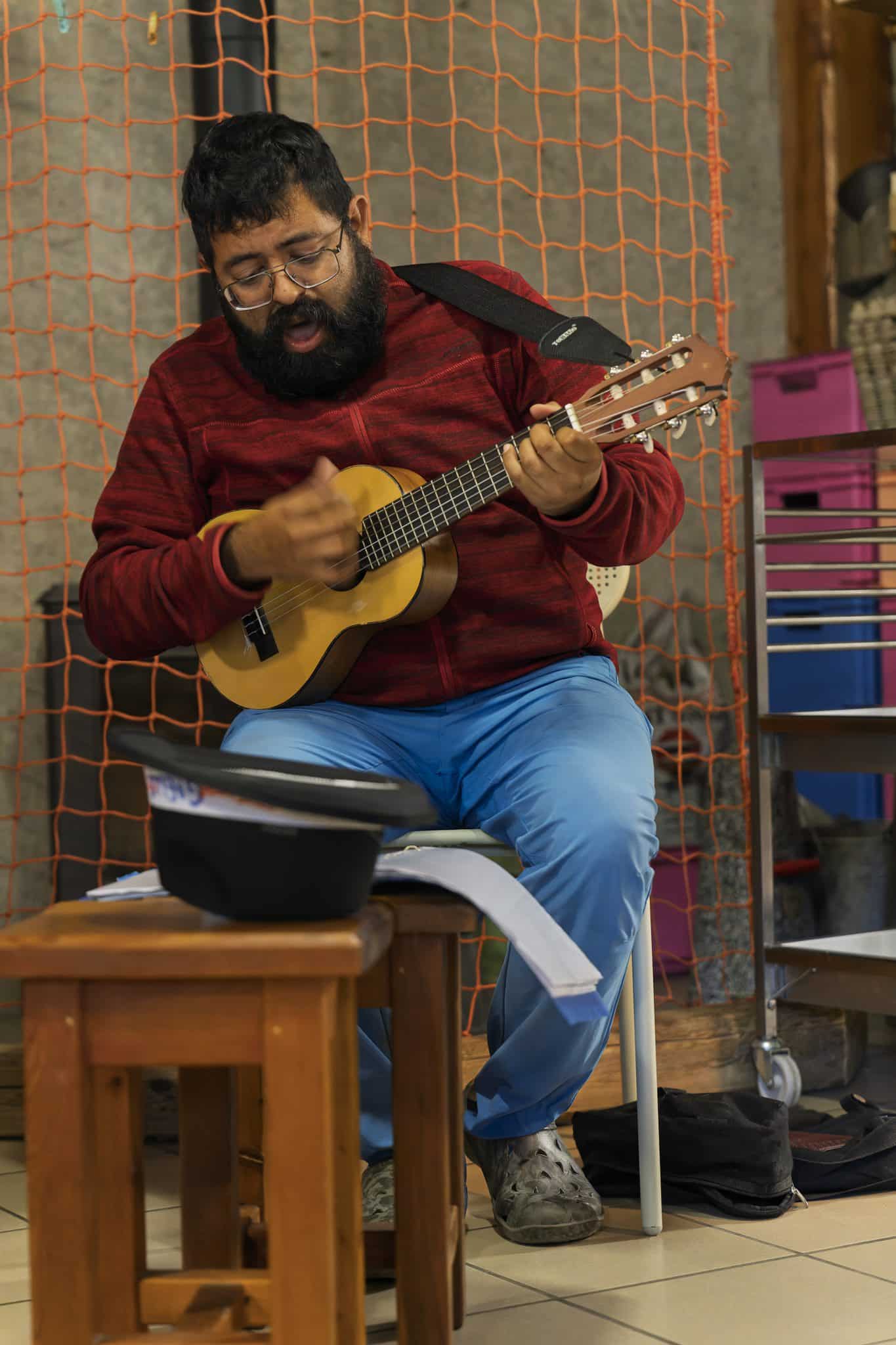 Nous buvons un coup et craquons pour une tarte à la myrtille sur la terrasse ensoleillée du refuge. À la fin du dîner, Mauricio Montufar, chercheur et professeur de musique médiévale du XIIIème siècle, nous a chanté des grands classiques de la musique sud-américaine. Une façon inattendue de terminer la soirée.