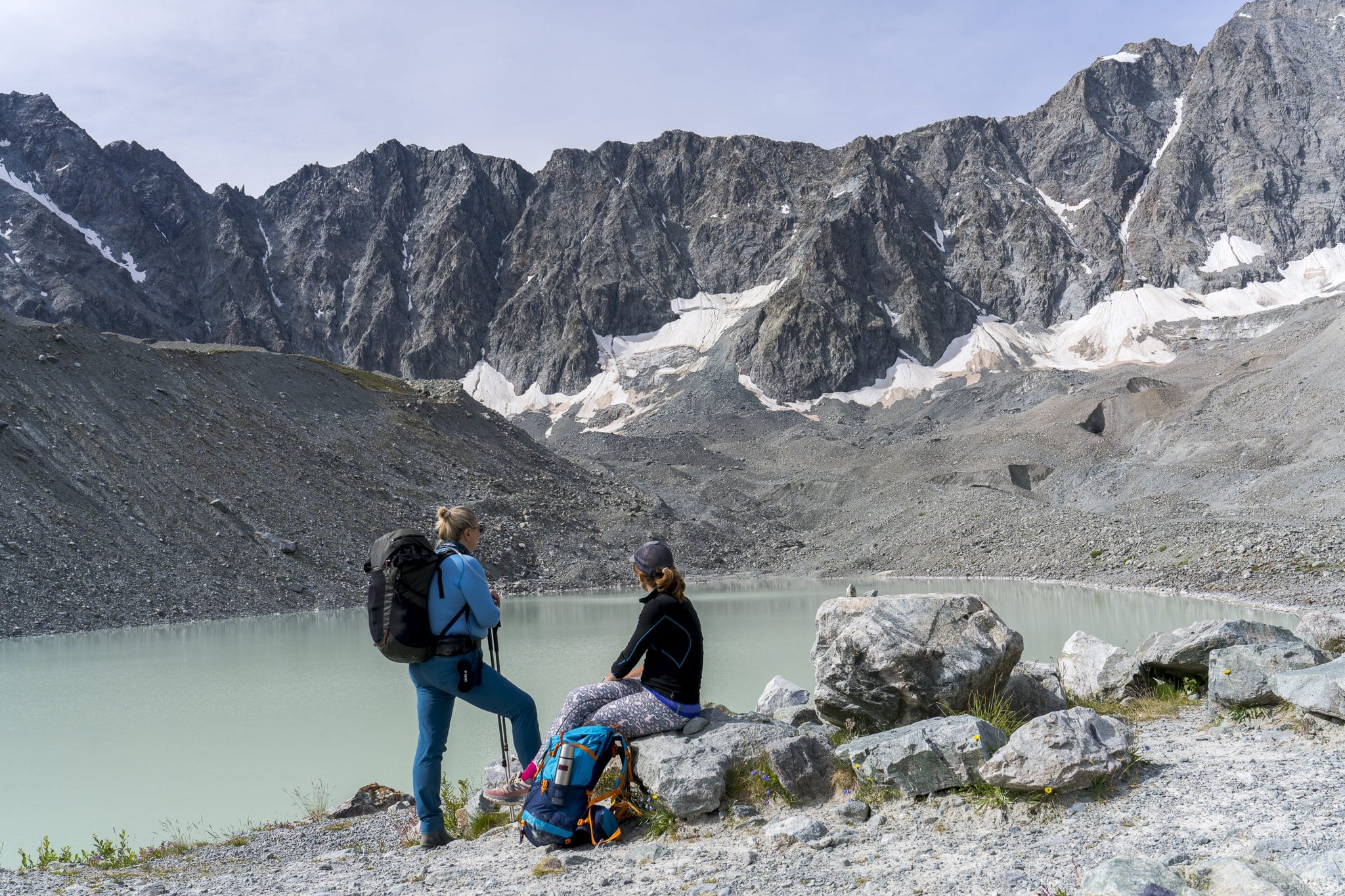 Nous finissons par rejoindre le col d'Arsine (2348 m). Nous laissons le GR54 de côté pour grimper au lac du glacier d'Arsine vraisemblablement formé autour de 1940. Niché au milieu des glaciers des Ecrins, le lac du glacier d’Arsine dévoile une étendue d'eau laiteuse, née des neiges éternelles. Entouré de moraines et de sommets majestueux, il témoigne du recul des glaciers.