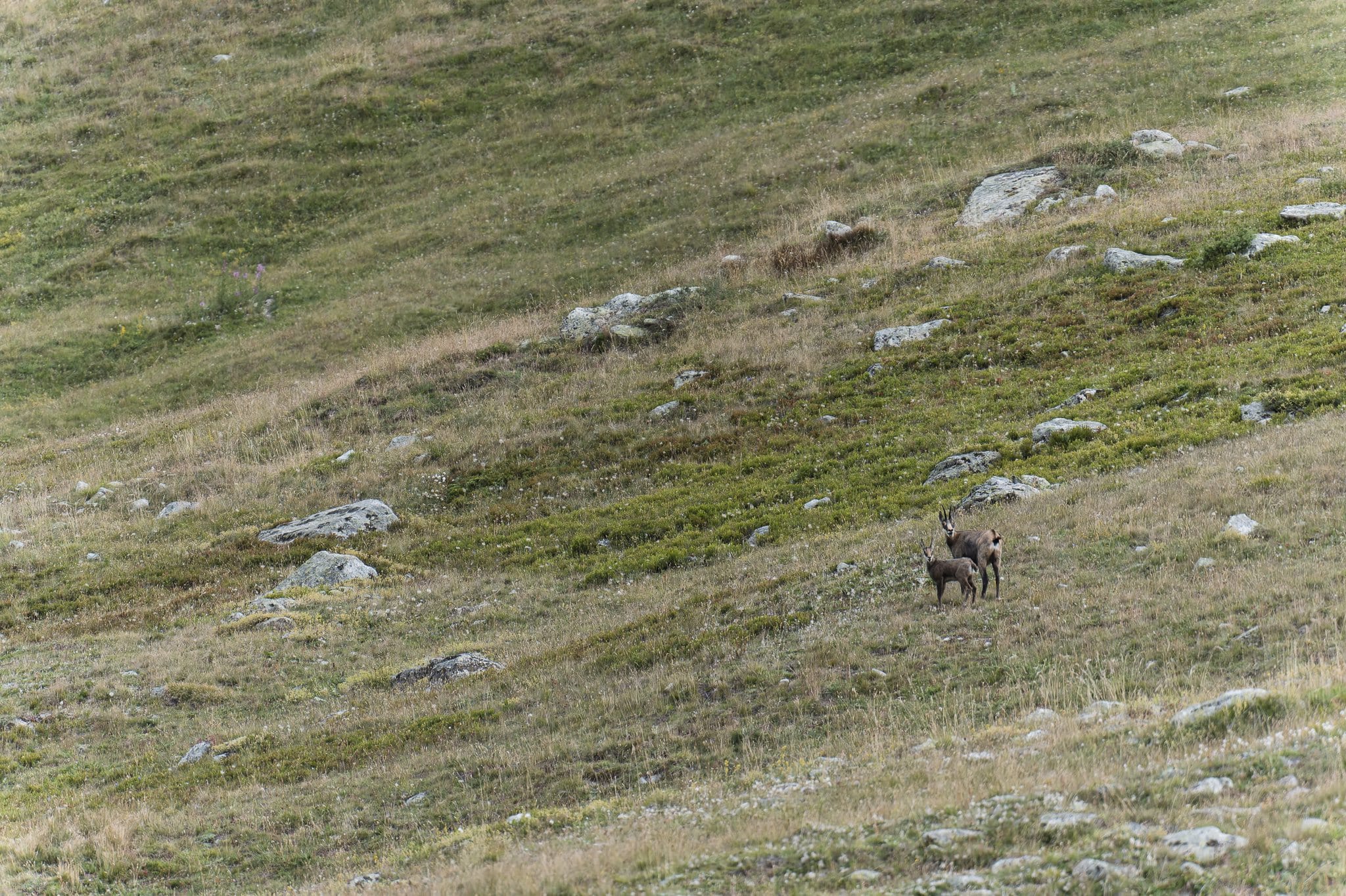 + 381 m / – 942 m 12,9 km La GuisaneIl est un peu plus de 7h30 lorsque nous quittons le refuge de l'Alpe de Villar d'Arène en direction du col d'Arsine. Le soleil n'éclaire pas encore la vallée et les marmottes sont encore dans leur terrier. Il faut dire qu'il ne fait pas très chaud, autour de 7°C. Nous prenons notre temps, l'étape n'est pas très longue. Je suis aux aguets du moindre signe d'un animal. Je suis vite récompensé par les vols de plusieurs couples de niverolles alpines et de traquets motteux. Je jumelle à plusieurs reprises les pentes dans l'espoir d'observer un chamois. Bingo, une femelle et son jeune traversent la vallée d'un pan de montagne à un autre à 200-300 m de notre position.