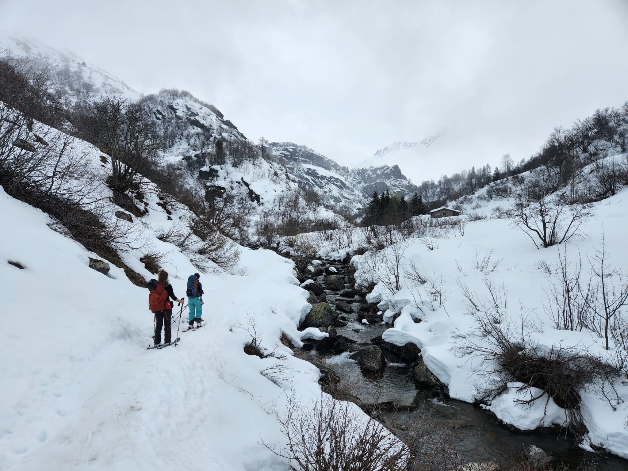 On finit par arriver au refuge de Terre Rouge après 3 heures de progression et environ 450m de dénivelé positif, dans le brouillard et sous la neige. Au jeu du premier qui repère le refuge, c’est Julie qui gagne 😉