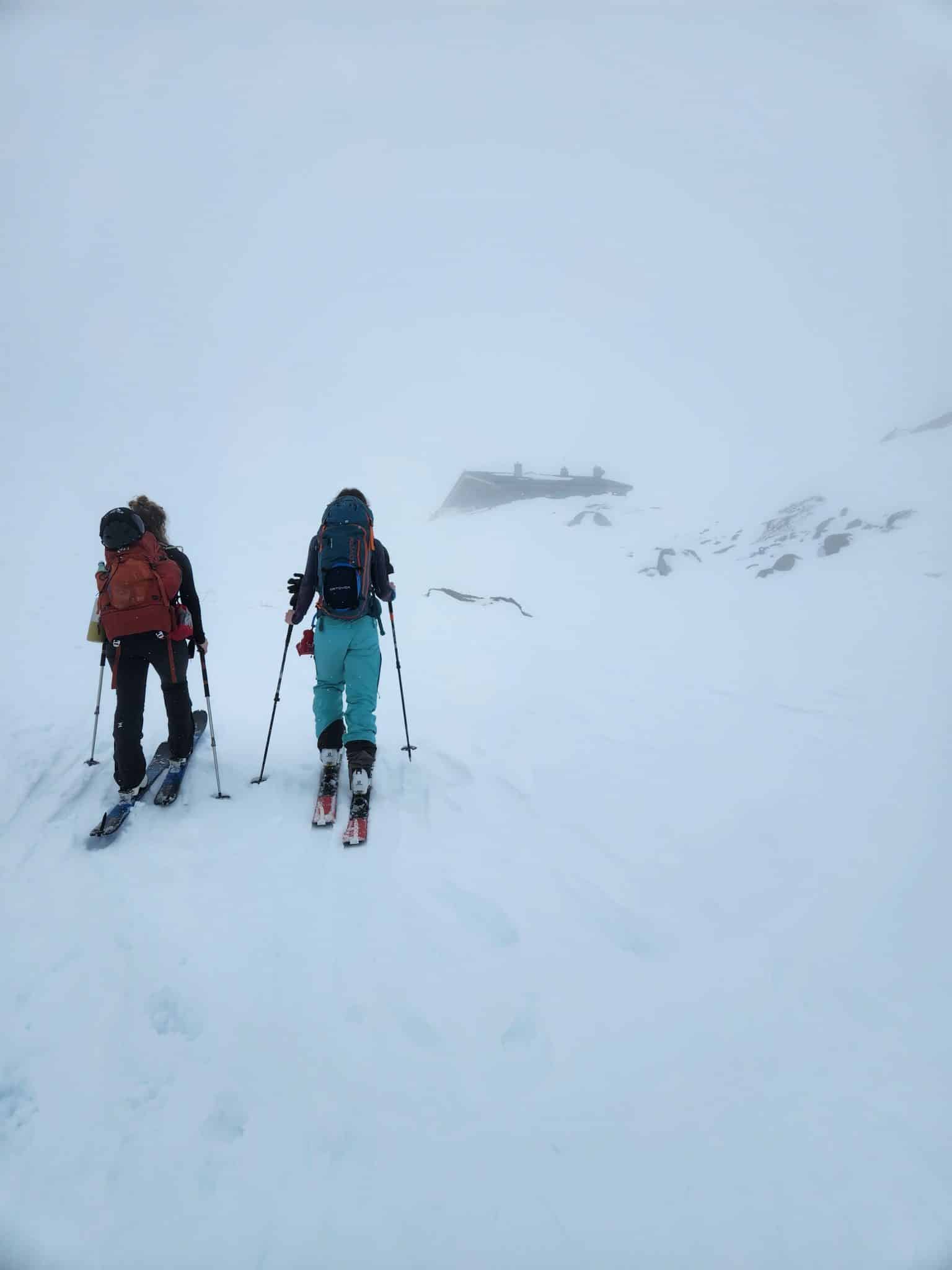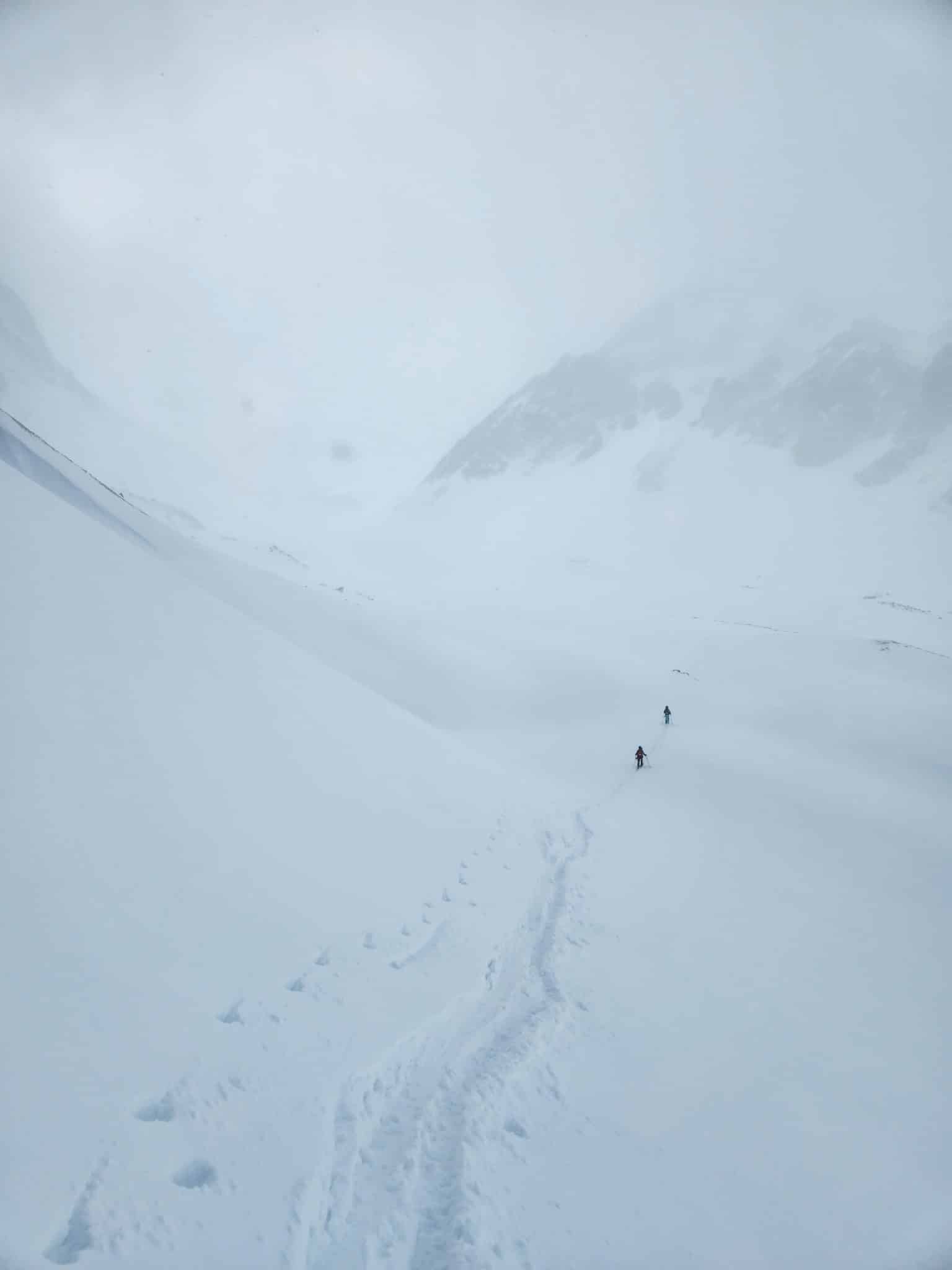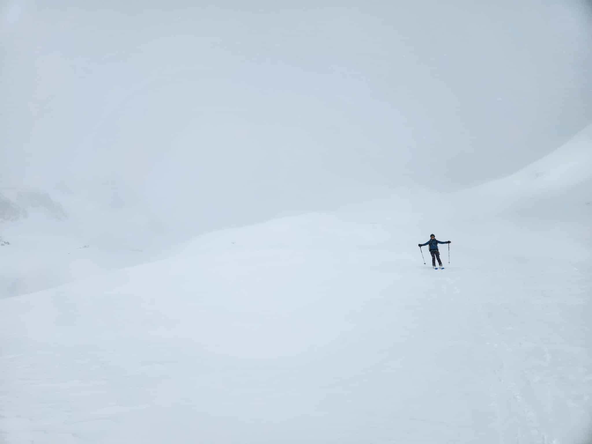 Le groupe nous double et fait la trace, c’est un chouette relais. Nous arrivons sans encombre au col du Vallon. Ici les conditions sont folles ! On ne tient presque pas debout, les rafales nous poussent. Si tu lâches ton bâton ou ton ski, tu ne les retrouves jamais ! De plus, il y a une plaque à vent qui est partie juste de l’autre côté du col. Elle est assez étroite mais pas mal épaisse. Ça jette un froid.