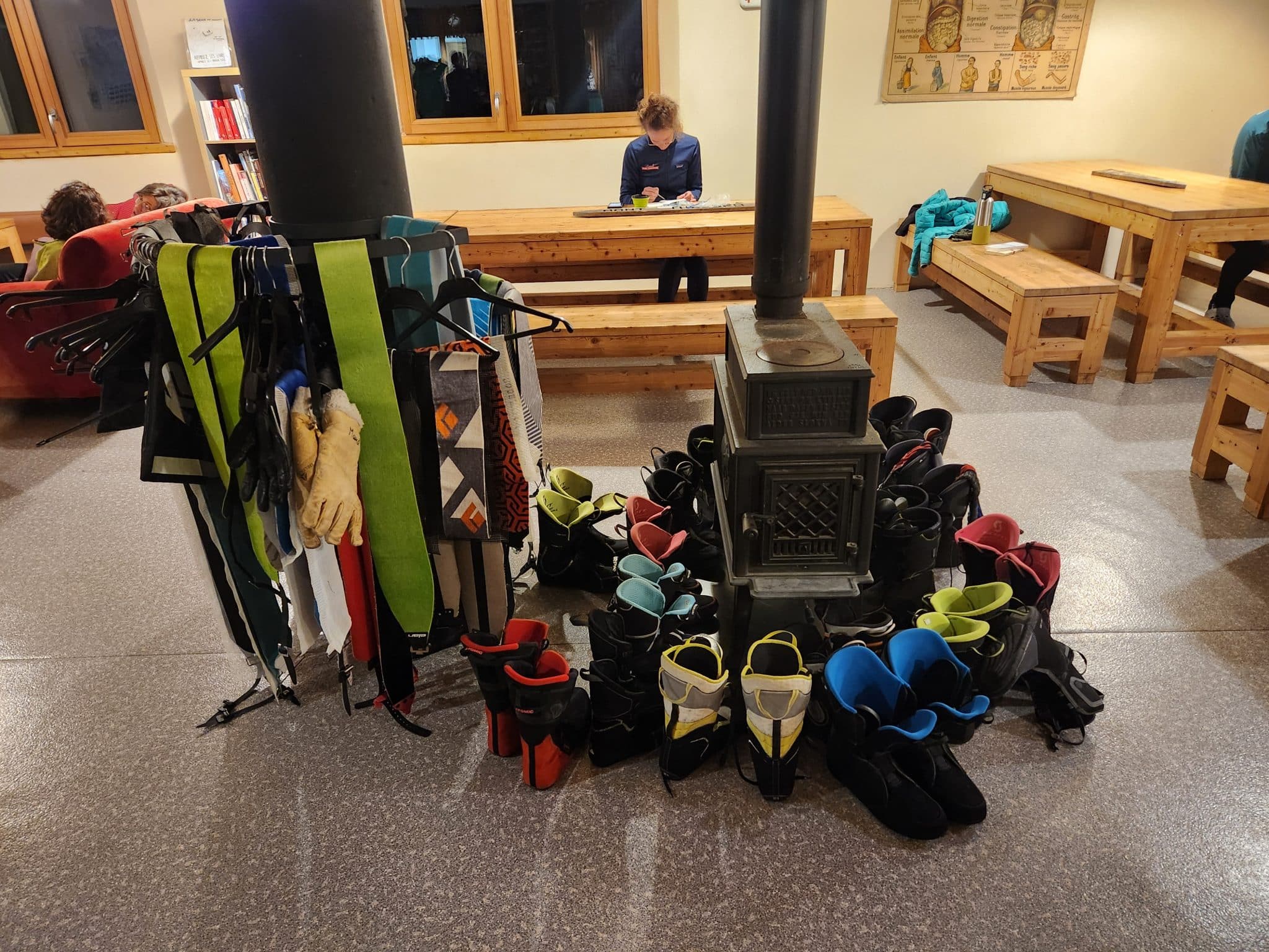 Le refuge est perdu en fond de vallée, comme posé là. Visuellement, c’est celui que je préfère, il fait vraiment refuge du bout du monde, entouré de grosses montagnes. Et l’intérieur ne va pas avec l’extérieur, c’est très cantine scolaire avec du carrelage au sol et des lavabos comme à l’école. On passe l’après-midi à lire et à peindre dans les transats, puis dans les canapés. On se sent ici comme à la maison. Encore une fois, nous avons un dortoir de 6 personnes pour nous trois, un vrai luxe ! Et il y a également des douches.