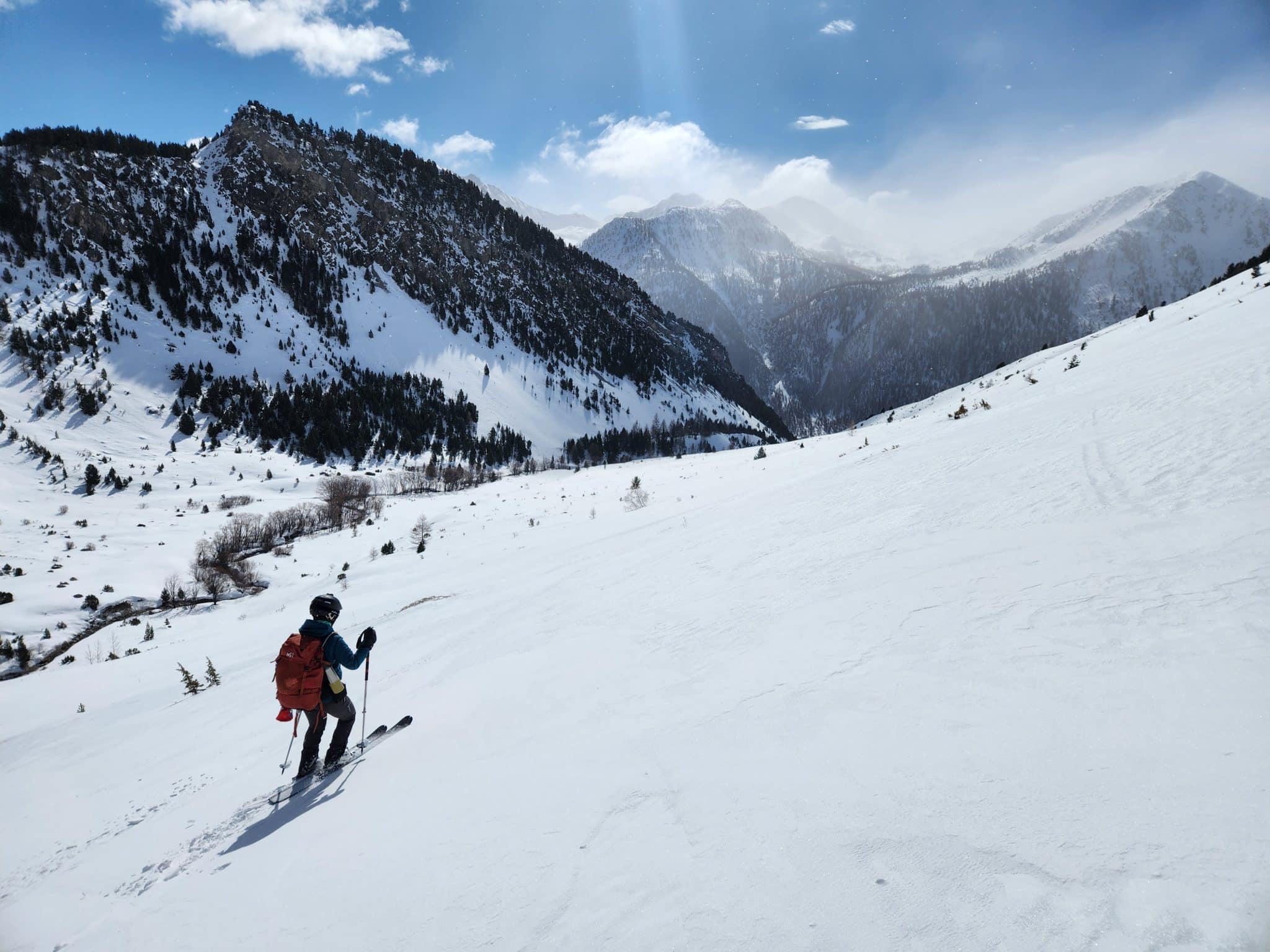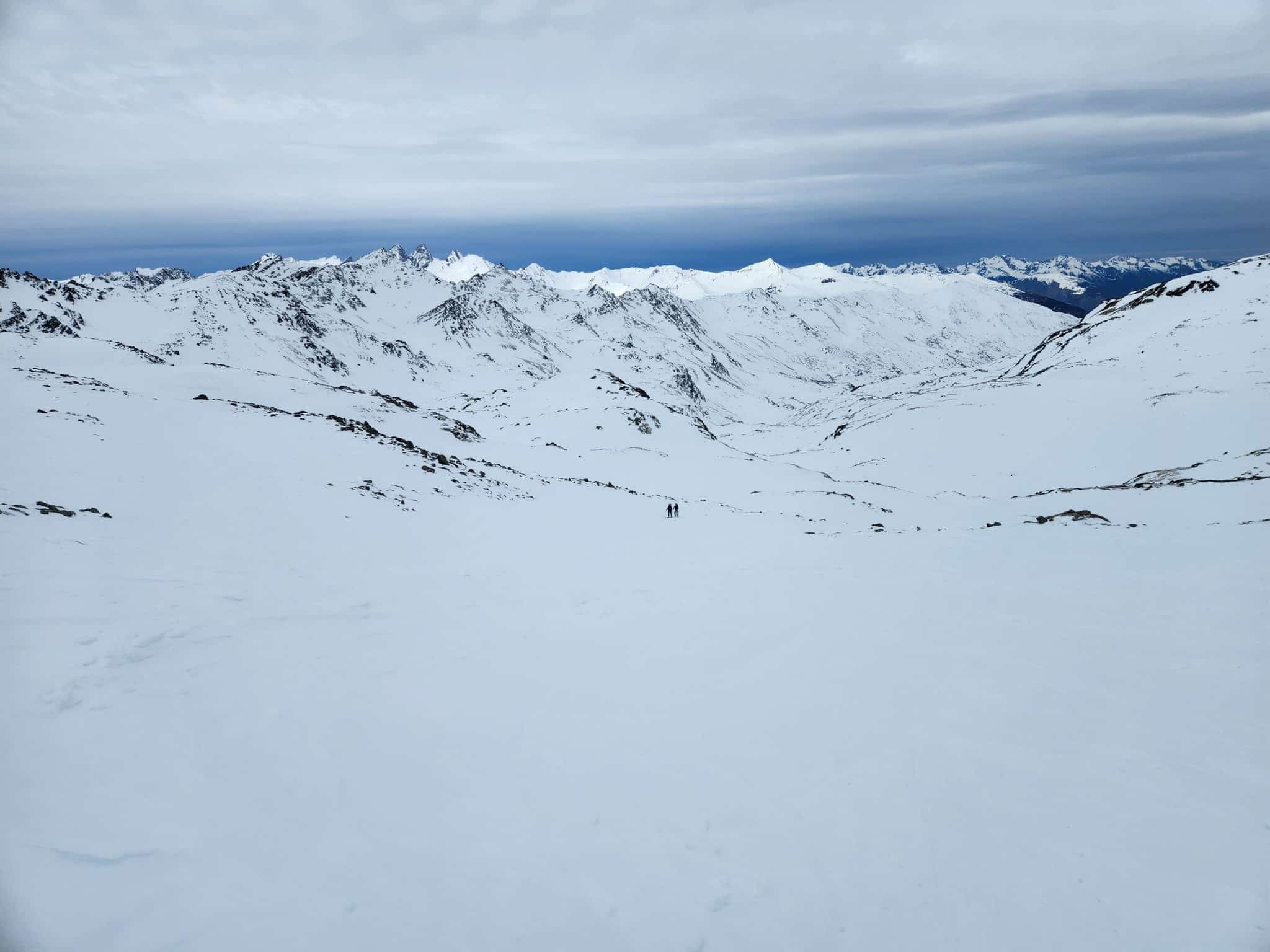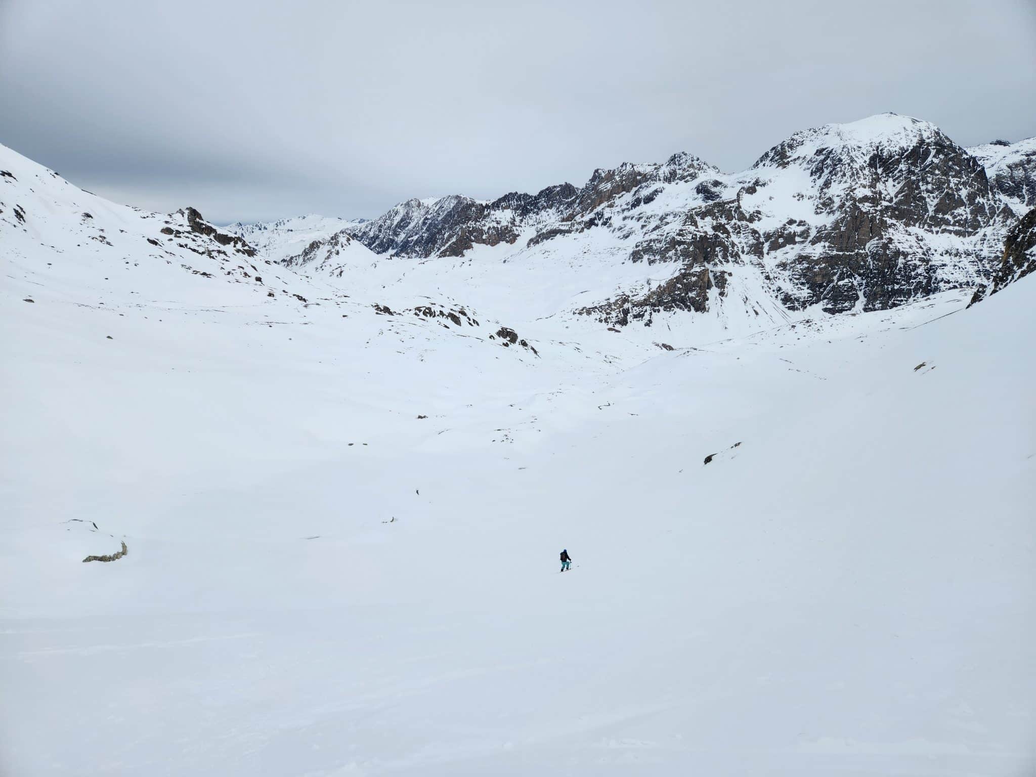 On commence par se laisser glisser pour rejoindre le col de la Vallée Etroite. Ici, on met les peaux de phoque pour monter en direction du col de Fontaine Froide, puis du col de la Gran Bagna, notre objectif du jour.