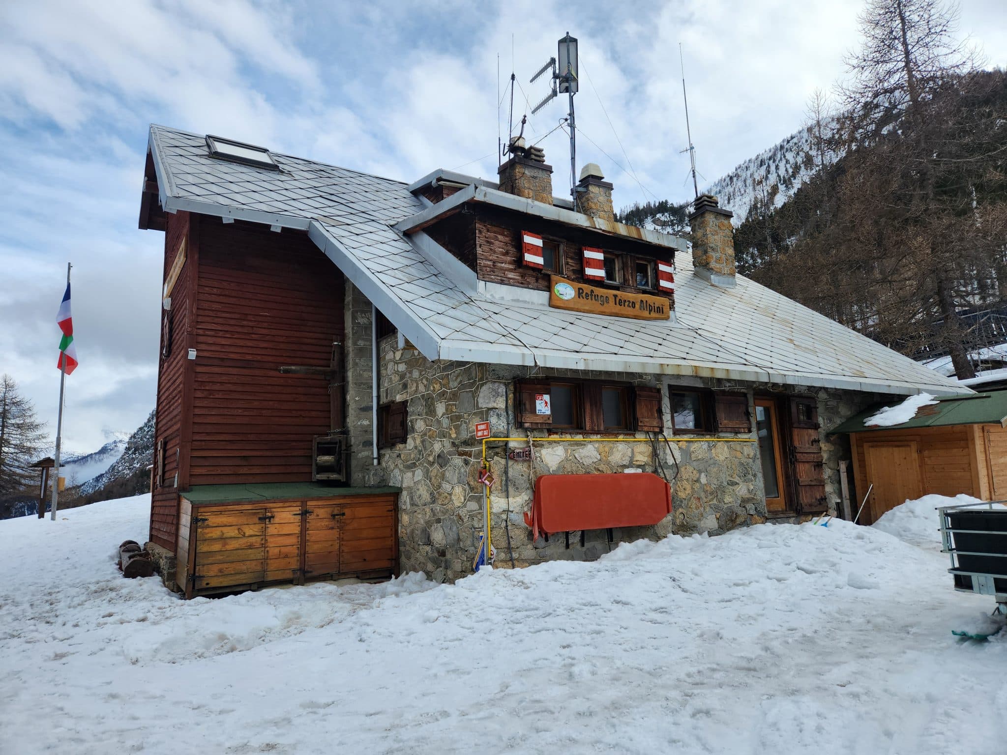 Nous arrivons au refuge de Terzo Alpini vers midi. L’accueil ici est excellent. La vallée étroite a la particularité d’être en France, mais d’être gérée par les italiens. Donc c’est en italien que l’on nous souhaite la bienvenue et qu’on nous sert une bière, mais sur la porte, c’est écrit licence 4 et règlementation française. Drôle de contraste.