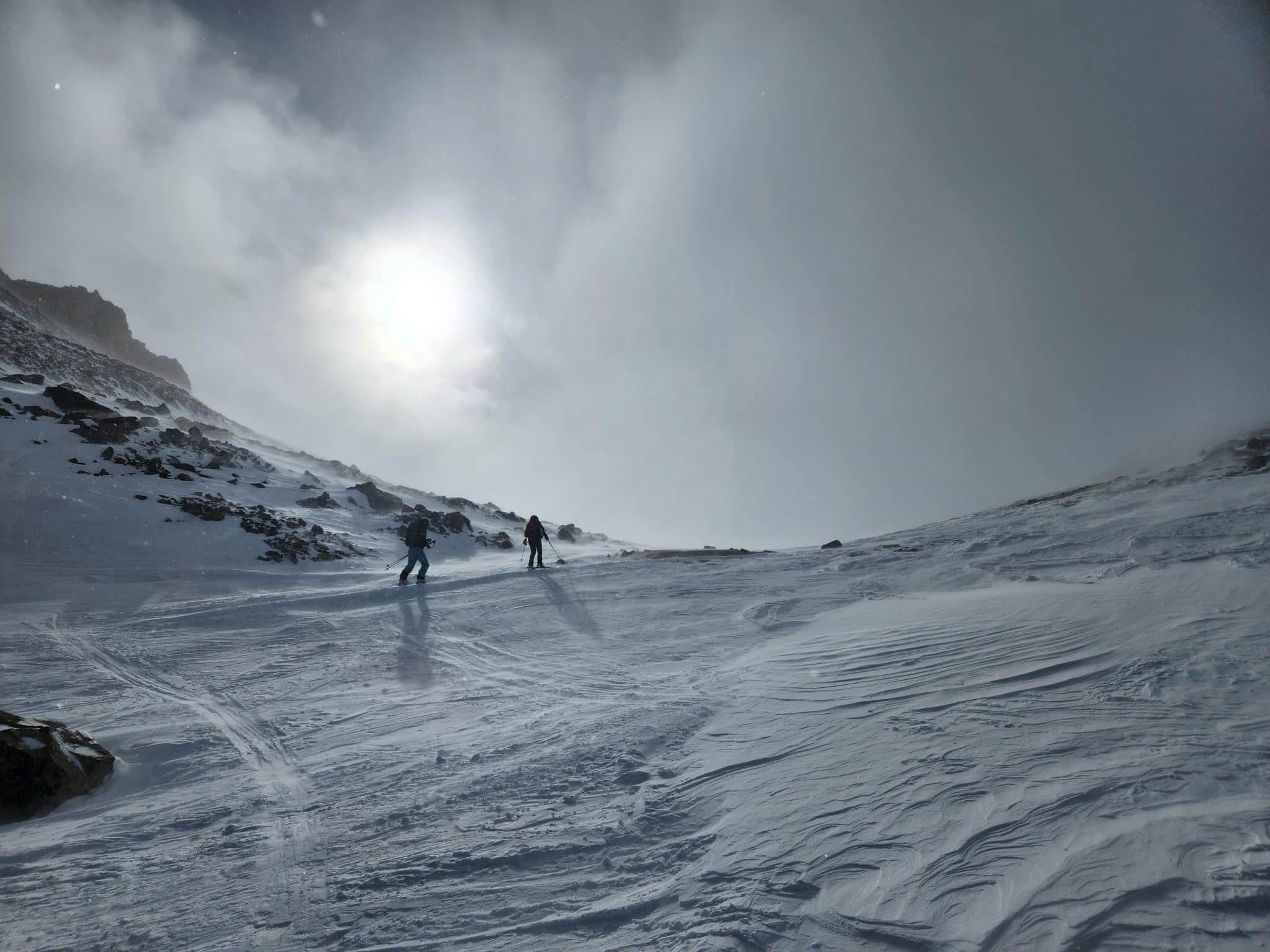 Arrivées sous la Tête du Chien, on commence à se poser les questions. Il y a un vent de fou, il fait froid et nous avons devant nous une pente un peu plus raide à remonter. Aujourd’hui le BERA (Bulletin d’estimation du risque d’avalanche) disait risque 2 au-dessus de 2300 mètres, avec un risque de petites plaques à vent. Donc risque relativement modéré, on analyse, on se concerte et on y va.