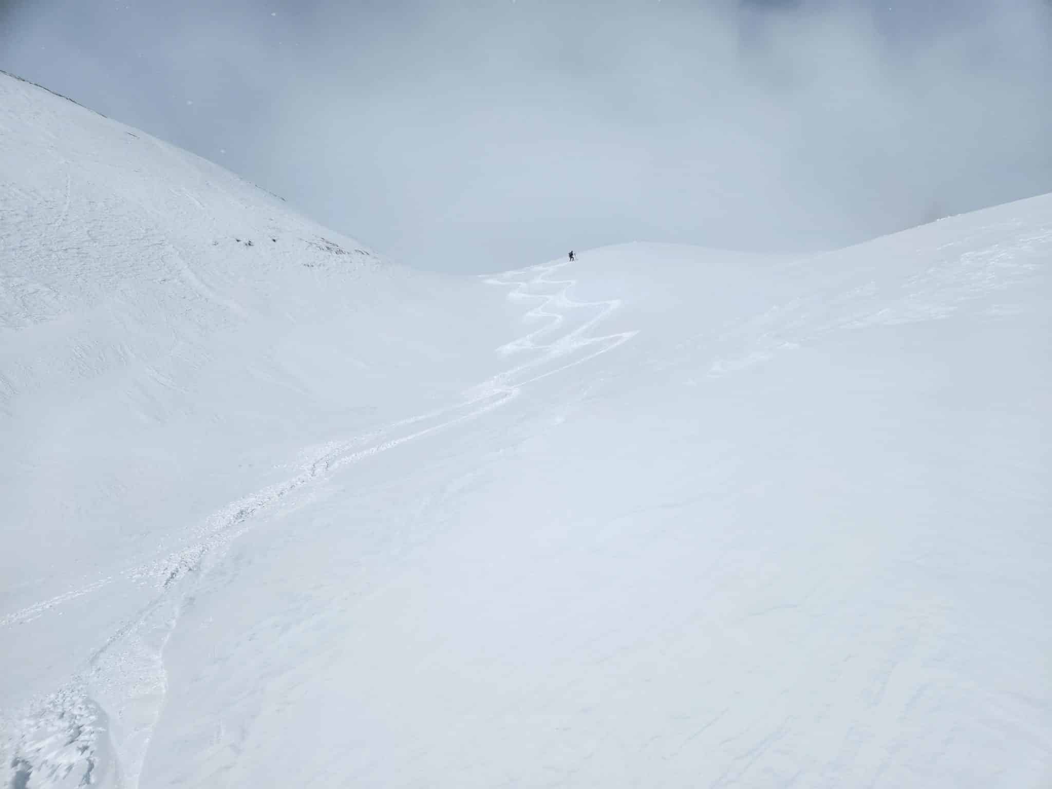 Ici, c'est magnifique, sauvage, vierge. Il y a des traces à faire partout, et tout a l’air de se skier. Et encore une fois, personne ! C’est fou ce contraste entre le nombre important de refuges ouverts, et pleins, et le peu de gens en montagne. On croise une trace bizarre de loin, très rectiligne et très grosse. Trop pour un animal, et ce ne sont pas des traces de ski. Une fois le nez dessus, c’est la stupeur pour moi, ce sont des traces de raquettes, d’une personne toute seule. Et, les traces montent droit vers un col à 2900 mètres ! Je trouve ça tellement fou, d’être seul en montagne, et en raquette… Mes a priori en prennent un coup.