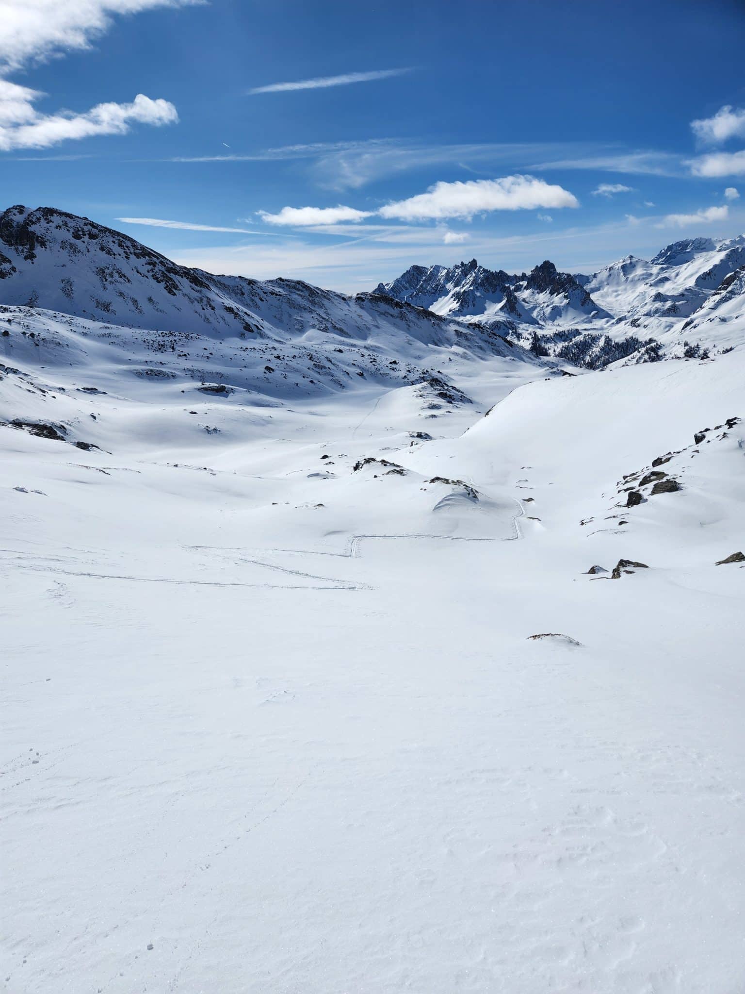 Nous montons en direction du col de la chapelle. Ici, on retrouve un autre groupe venu de nulle part, qui nous double. Nous prenons notre temps, on n’est pas pressé. La cartographie est tout un talent. Même avec un GPS, ma frangine se rend compte que ce n’est pas si facile que ça de se repérer, et de passer de la carte à la réalité. Du coup, on a failli plusieurs fois se retrouver à aller dans une autre direction. Heureusement, j’ai pu mettre mes talents d’accompagnatrice en montagne pour les remettre sur la voie. Dans tous les cas, c’était un win /win . Les filles ont plus la forme que moi, donc elle m’attendait en faisant des points cartes 😉. Et moi, je reprenais mon souffle (c’est haut le Thabor !). Ici les paysages sont grandioses. Nous avons derrière nous une vue sur une vallée très large, avec pas de traces de skieurs, absolument personne. Au fond, on voit les pistes de ski de Valmeinier et le refuge de Terre Rouge. Au-dessus de nous, le Roc de Valmeinier nous domine avec ces aiguilles saillantes. C’est très photogénique, avec ce ciel un peu couvert et le soleil voilé. C’est une ambiance sympathique.