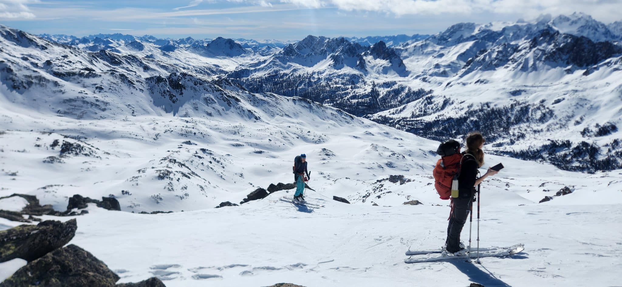 Je crois qu’on s’est mis dans la tête que c’était une petite journée, alors que pas tant que ça, si bien qu’on était toutes contentes d’arriver au col. On a cassé la croute sous le col, sur des cailloux, à l’abri du vent et avec une vue de folie. C’est un coin pique-nique 4 étoiles ! On a pu suivre l’avancée du groupe parti en même temps que nous du refuge, qui sont à l’opposé de la vallée, faire de la lecture de paysage pour trouver le nom de tous les sommets aux alentours, imaginer notre prochain raid à ski…