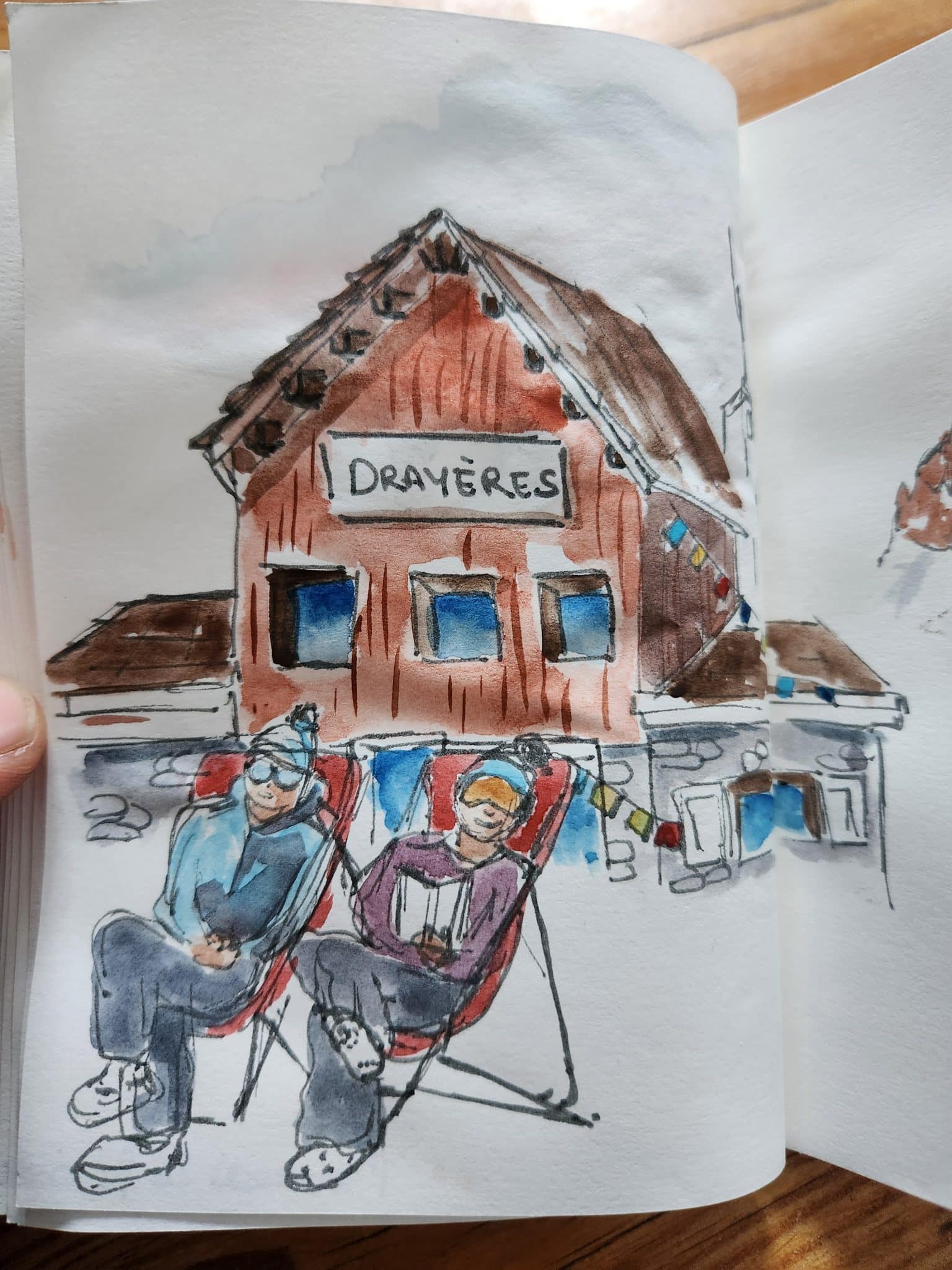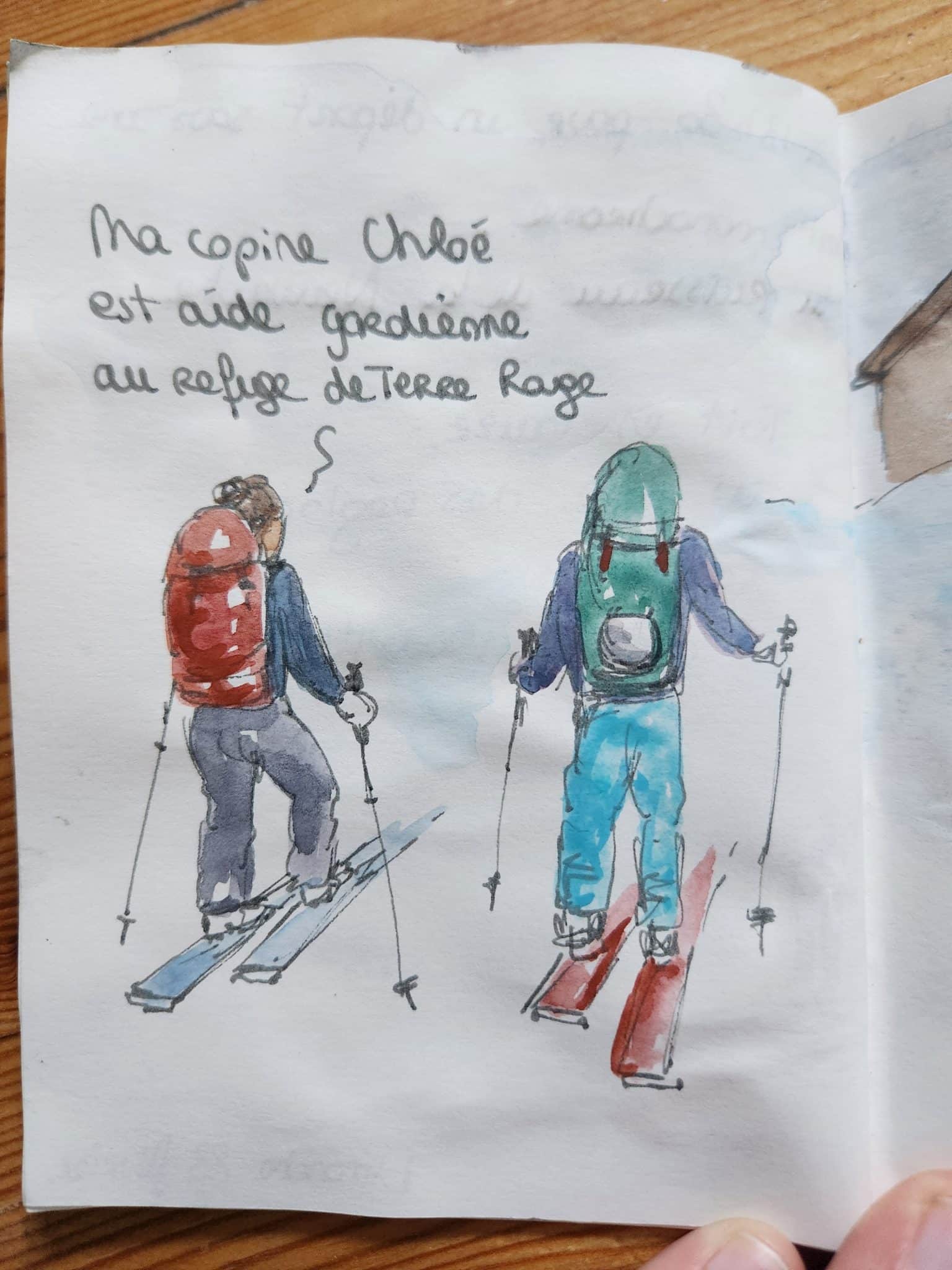 La descente est poudreuse, très jolie, on se balade en suivant le vallon. On repère la montée du lendemain, ainsi que le col. On se laisse tranquillement glisser jusqu’au refuge des Drayères, où on est accueilli par Voltaire qui aboie et par l’énorme Pako.