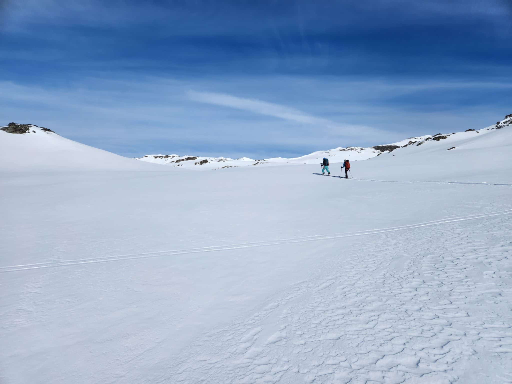 Après le petit déjeuner et un au revoir à Chloé, nous mettons les peaux de phoque pour partir à l’assaut du col de la Chapelle. Nous commençons par un grand plat, pour aller au fond de la vallée. Nous sommes partis tous ensemble du refuge, environ 25 personnes. Mais ici, il y a un croisement et chacun prend une direction différente.