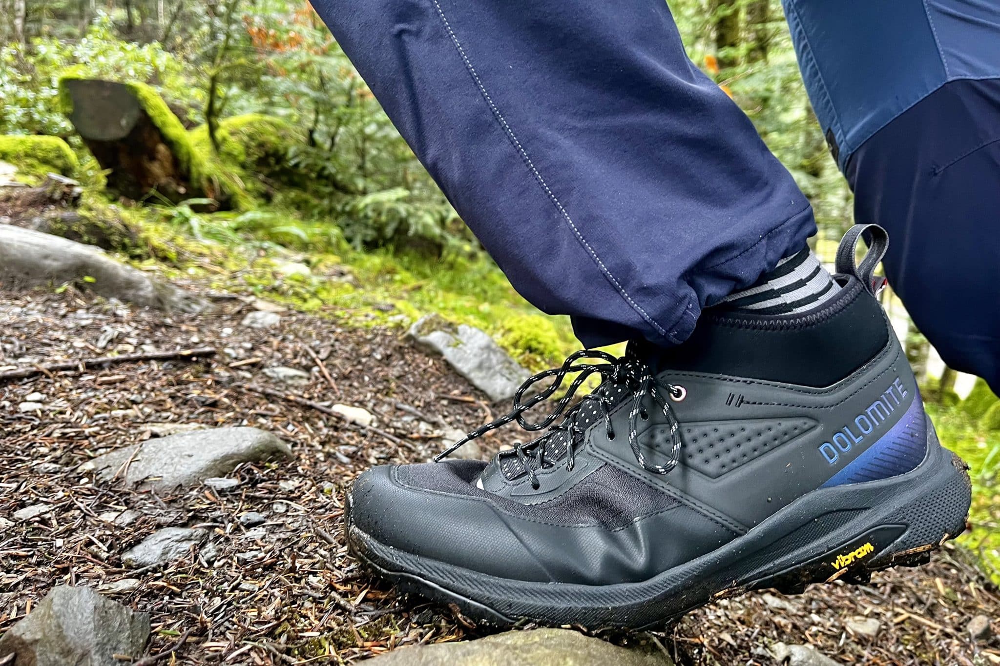 Les Dolomite Nibelia Warm sont équipées d’une semelle Vibram avec un design original de chez Dolomite, donc forcément l’adhérence est bien au rendez-vous. Aucun souci sur roche détrempée, dans la boue ou la neige, la chaussure tient ! Côté crampons, ils sont indiqués comme innovants et permettant adhérence, amorti et flexibilité sans ajouter de poids supplémentaire. Le poids des chaussures joue évidemment aussi, mais elles me semblent effectivement très réactives en montée. Quant à la descente, je me sens bien en confiance grâce à l’adhérence fournie par la semelle.