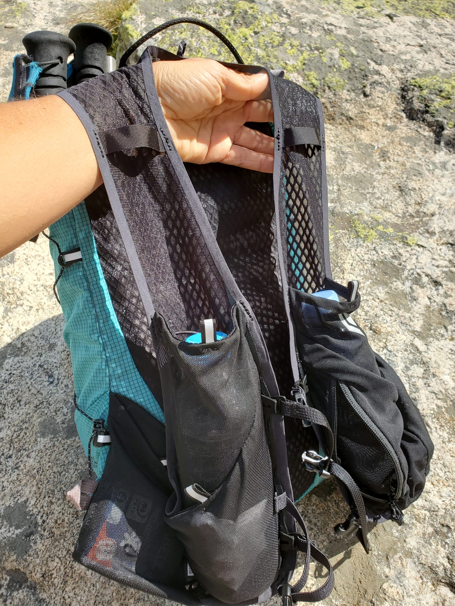 Toutes les autres poches de rangement sont situées sur les bretelles : 3 poches en mesh de chaque côté et une poche supplémentaire zippée sur la bretelle de droite. Elles sont très pratiques pour ranger tout ce dont on a besoin d’attraper en marchant, notamment des gourdes souples et le téléphone. Un vrai bémol cependant, une seule poche se ferme avec une fermeture éclair, toutes les autres n’ont pas vraiment de système de fermeture, il est donc très facile de perdre ce qu’on y range : cela m’est arrivé à deux reprises durant les 3 mois d’utilisation. Un scratch ou un petit système de serrage fait cruellement défaut.