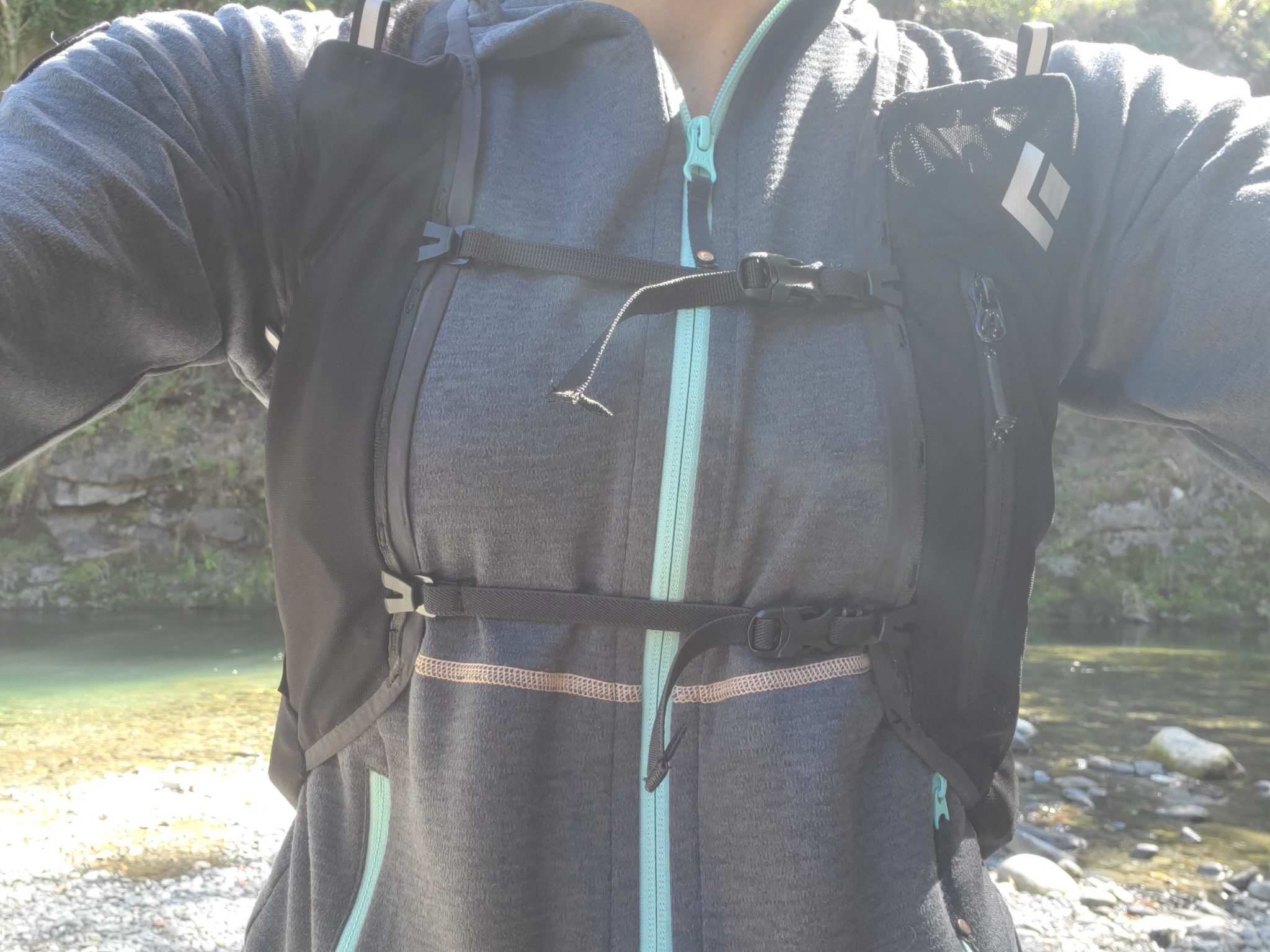 Le harnais et les bretelles se positionnent bien sur les épaules, contribuant à une bonne répartition de la charge. Black Diamond met en avant la technologie Edge Taping, sans couture pour plus de confort au niveau des bretelles. Et, effectivement, je n’ai été confrontée à aucun frottement désagréable ni à aucune gêne liée à la présence d’une quelconque surépaisseur ou couture. Le harnais s’adapte parfaitement bien à la morphologie féminine, avec deux sangles de poitrine permettant de courir sans se sentir compressée tout en ayant le sac bien positionné. Pour chaque sangle, deux positions sont possibles selon la taille et la morphologie de chacune.