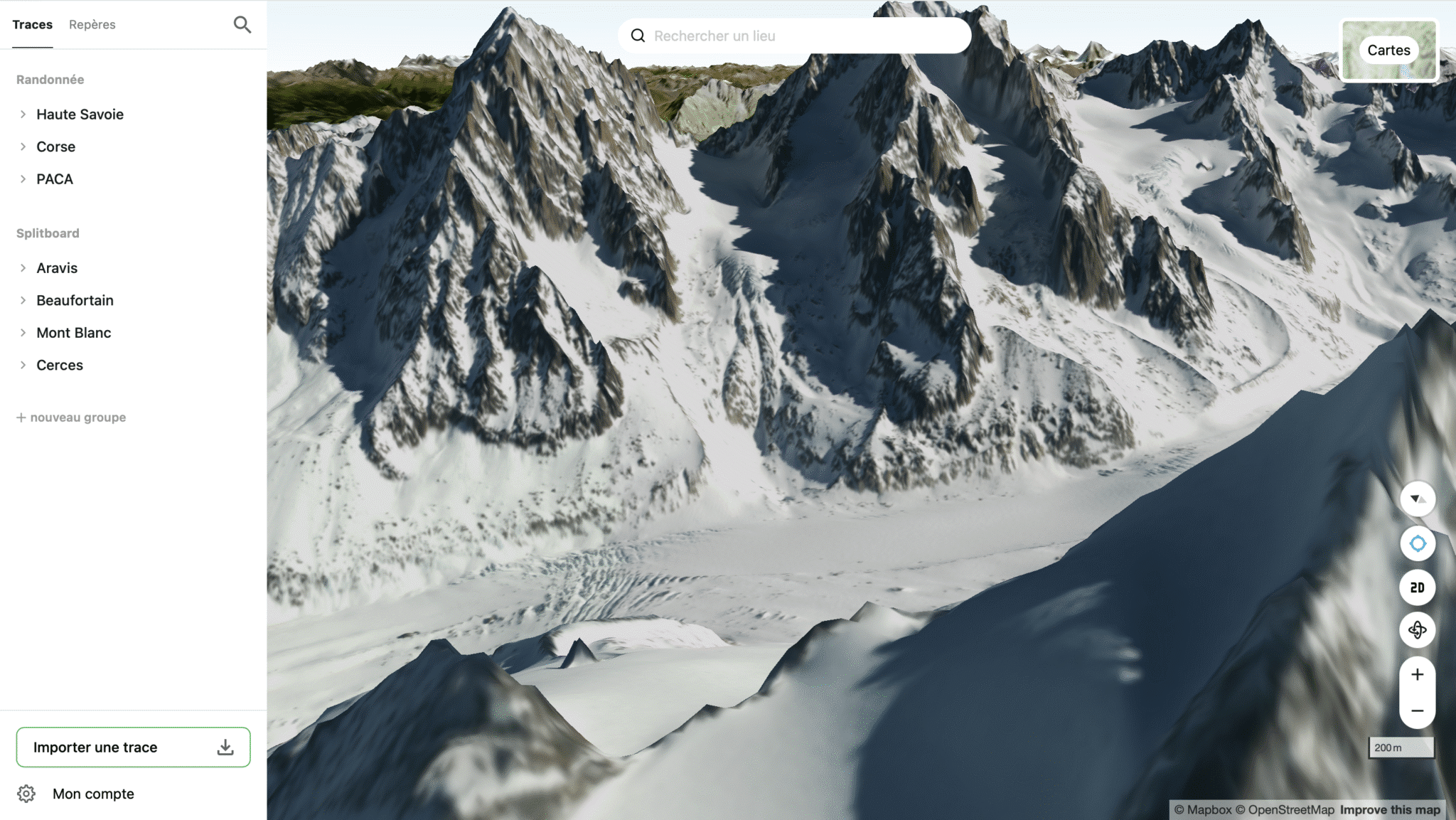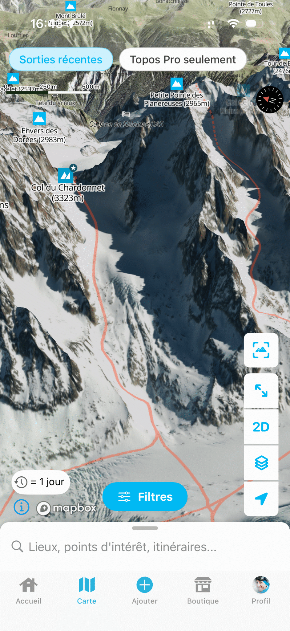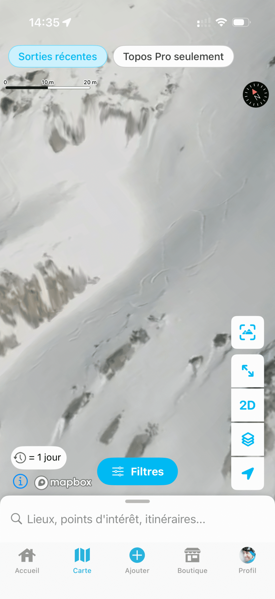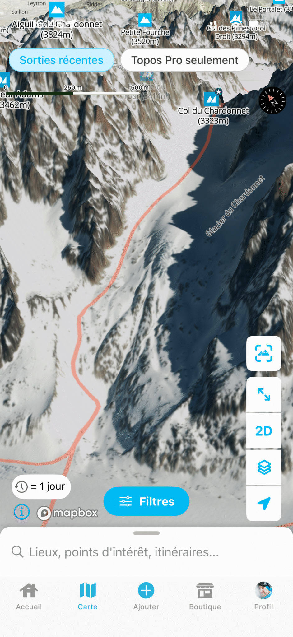 Après lecture des différents topos et des retours de skieurs de randonnée ayant déjà fait cette course, on peut aussi accéder à la carte depuis la fiche descriptive ! Et des cartes, il y en a ! Pour information, la 3D est disponible sur toutes les cartes avec une précision de 30 mètres en horizontal et 10 mètres en vertical partout dans la monde en version gratuite. Jusque là rien d'exceptionnel, mais là où Whympr se distingue des autres applications c'est avec ses cartes dont la précision va bien au-delà grâce à la technologie LiDAR qui permet d'obtenir une précision de 1 mètre en horizontal et 10 centimètres en vertical, disponibles avec la version Premium ou le Pack Outdoor. Cette dernière est automatiquement appliquée sur toutes les cartes de France, Italie, Suisse, Autriche, Allemagne et Espagne. Et enfin, toujours en Premium et pour aller encore plus loin, Whympr propose le massif du Mont Blanc hivernal en vue satellite 3D Haute Définition !
