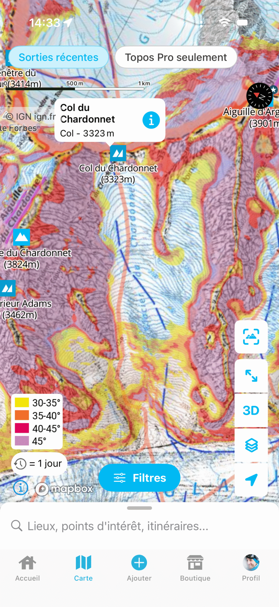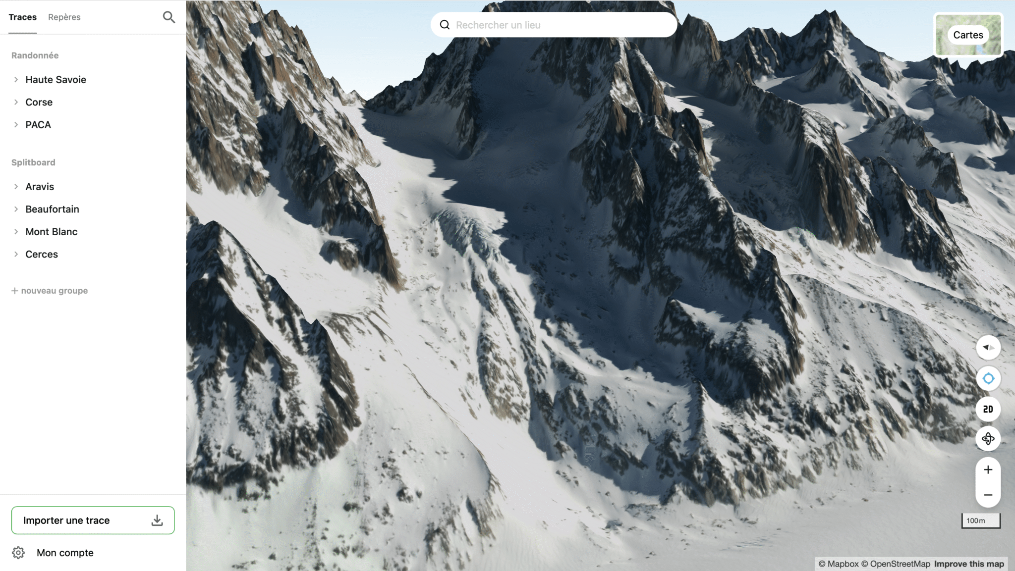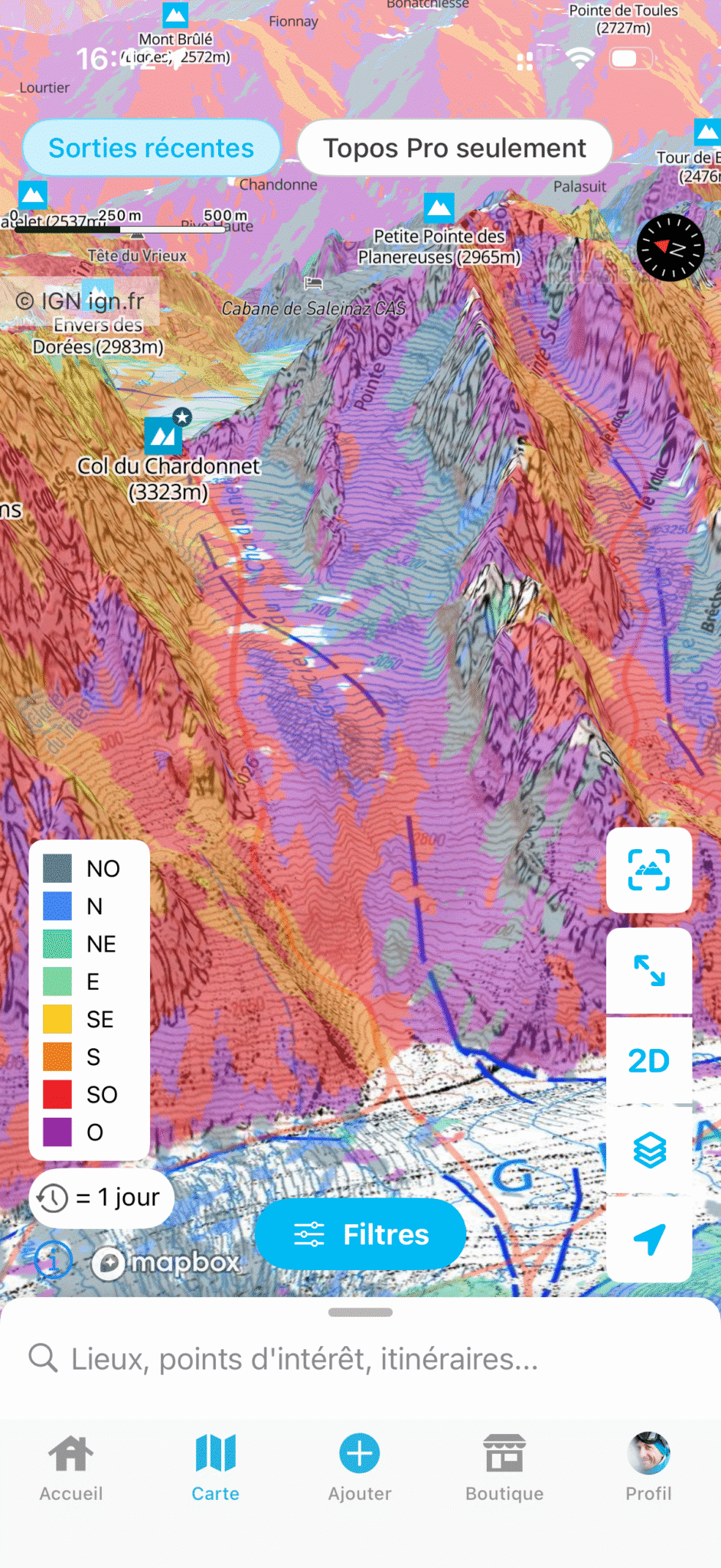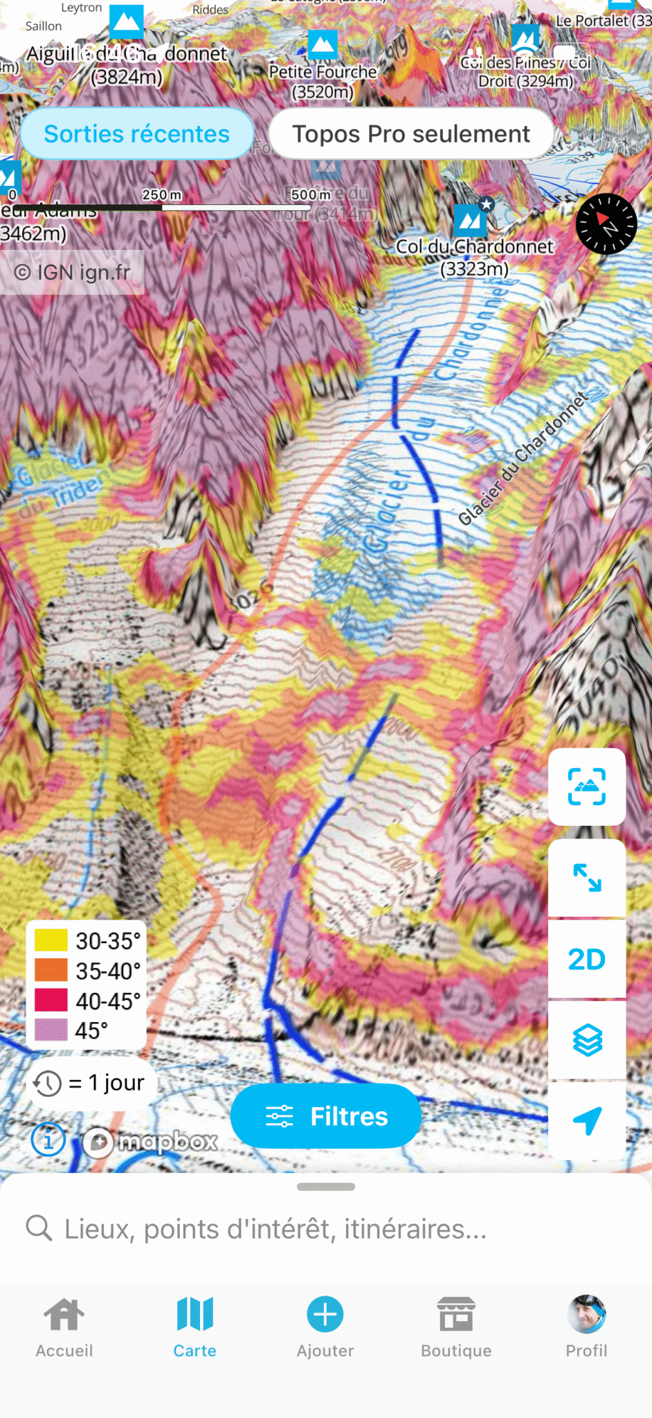 Après lecture des différents topos et des retours de skieurs de randonnée ayant déjà fait cette course, on peut aussi accéder à la carte depuis la fiche descriptive ! Et des cartes, il y en a ! Pour information, la 3D est disponible sur toutes les cartes avec une précision de 30 mètres en horizontal et 10 mètres en vertical partout dans la monde en version gratuite. Jusque là rien d'exceptionnel, mais là où Whympr se distingue des autres applications c'est avec ses cartes dont la précision va bien au-delà grâce à la technologie LiDAR qui permet d'obtenir une précision de 1 mètre en horizontal et 10 centimètres en vertical, disponibles avec la version Premium ou le Pack Outdoor. Cette dernière est automatiquement appliquée sur toutes les cartes de France, Italie, Suisse, Autriche, Allemagne et Espagne. Et enfin, toujours en Premium et pour aller encore plus loin, Whympr propose le massif du Mont Blanc hivernal en vue satellite 3D Haute Définition !