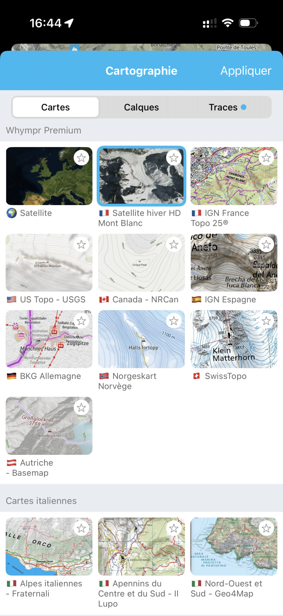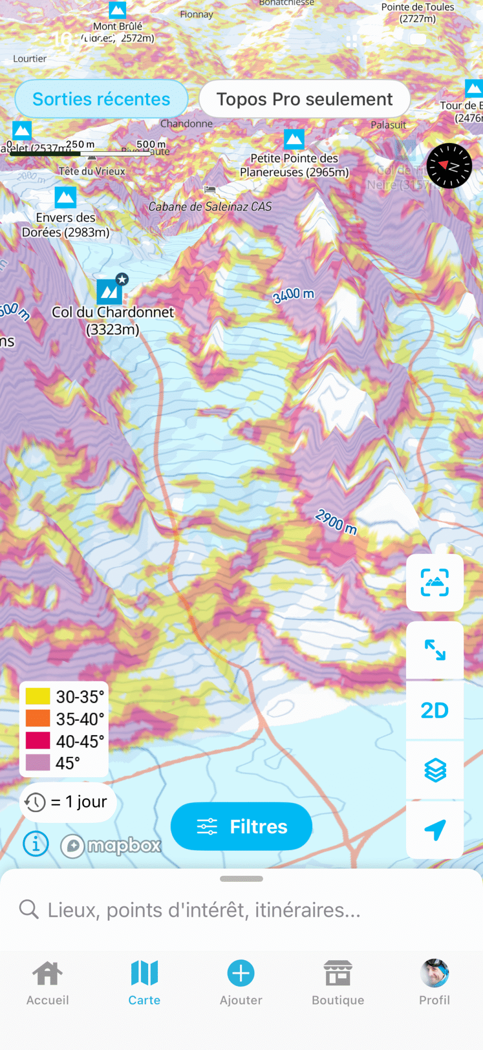 Sans abonnement, seule la carte Open Street Map appelée Whympr Outdoor est proposée, en version été et en version hiver. Alors qu’avec abonnement les cartes topographiques de nombreux pays sont ajoutées. Côté Col du Chardonnet, on trouve la superbe carte satellite 3D Haute Définition du massif du Mont Blanc, et les calques d’inclinaison et d'orientation des pentes – applicables sur tous les fonds de cartes même en 3D – ainsi que le calque des traces hivernales revues par Petzl.