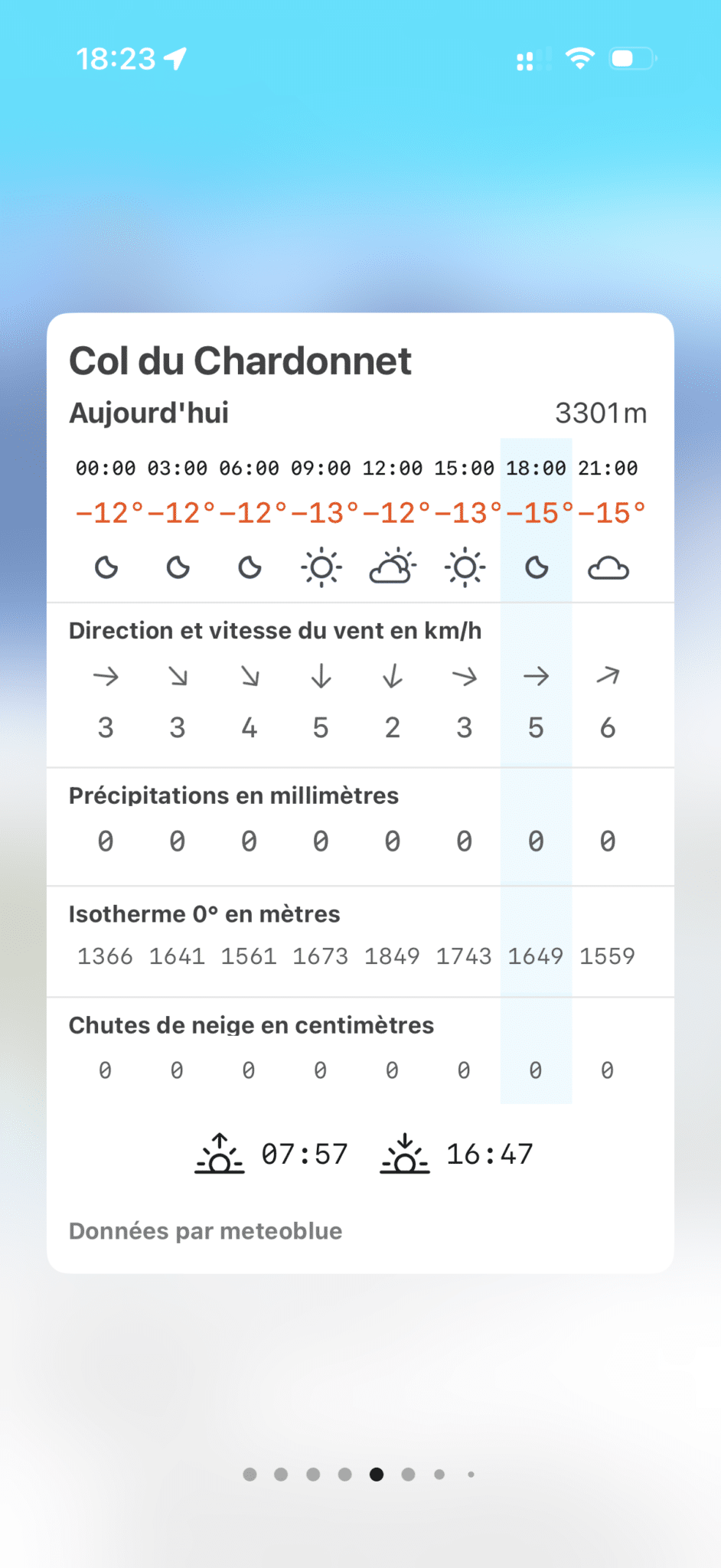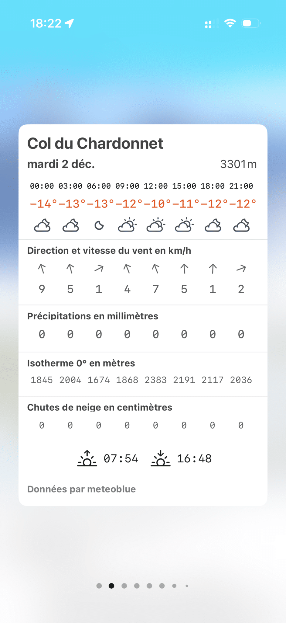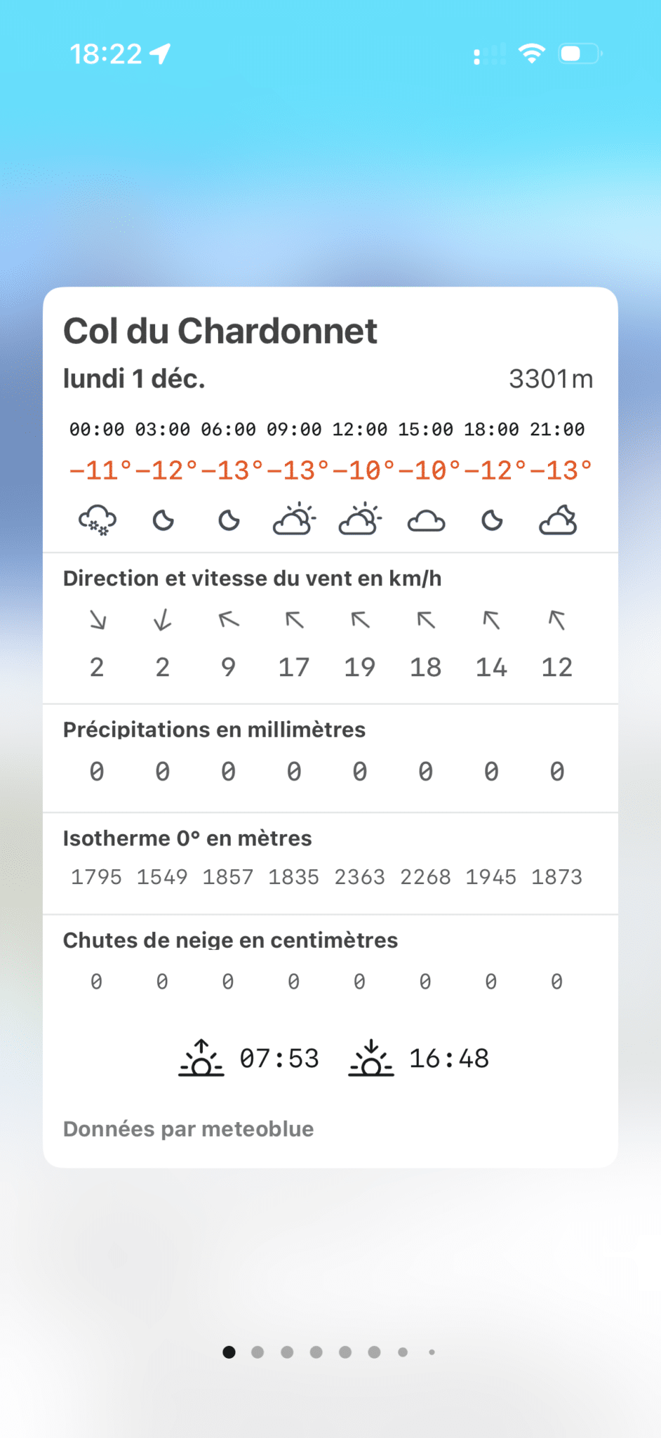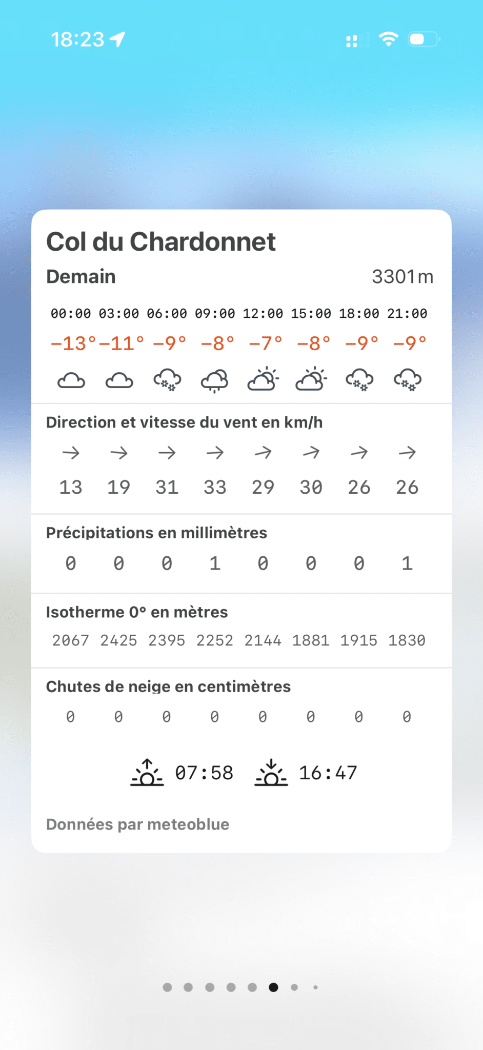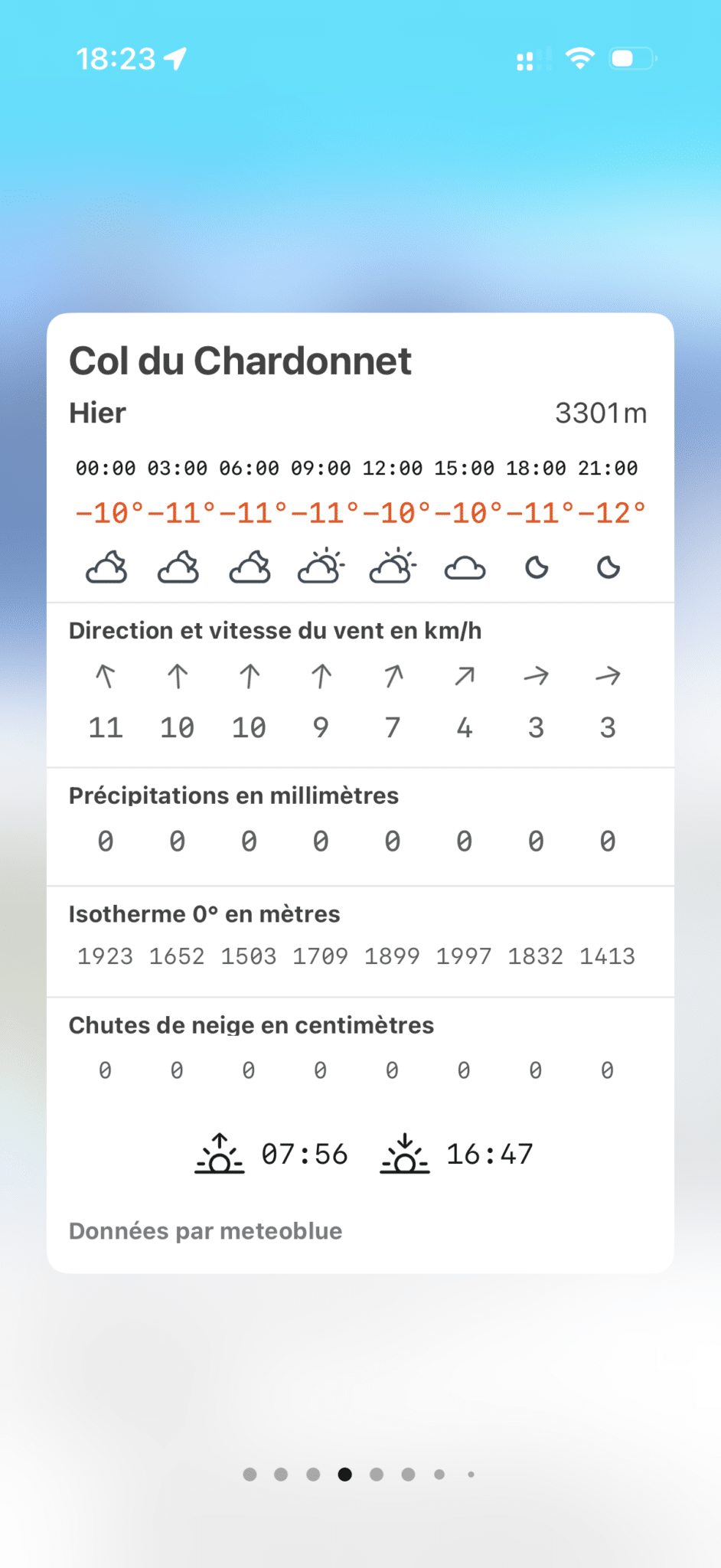 Il existe nombre d’applications et de sites web permettant d’étudier la météo. Pour ma part, celle que je préfère est meteoblue, et ce n’est pas un hasard si Whympr a choisi de l’intégrer directement dans son application car c'est une référence chez les montagnards. Mais Whympr ne s’est pas contenté d’afficher la météo du jour sur sa page d’accueil des sorties. Pour aller plus loin, l’application permet d’accéder en un toucher de doigt à la météo du secteur de l’itinéraire étudié, d’avoir ses prévisions sur 4 jours supplémentaires, et surtout d’en avoir un historique jusqu’à 4 jours en arrière.