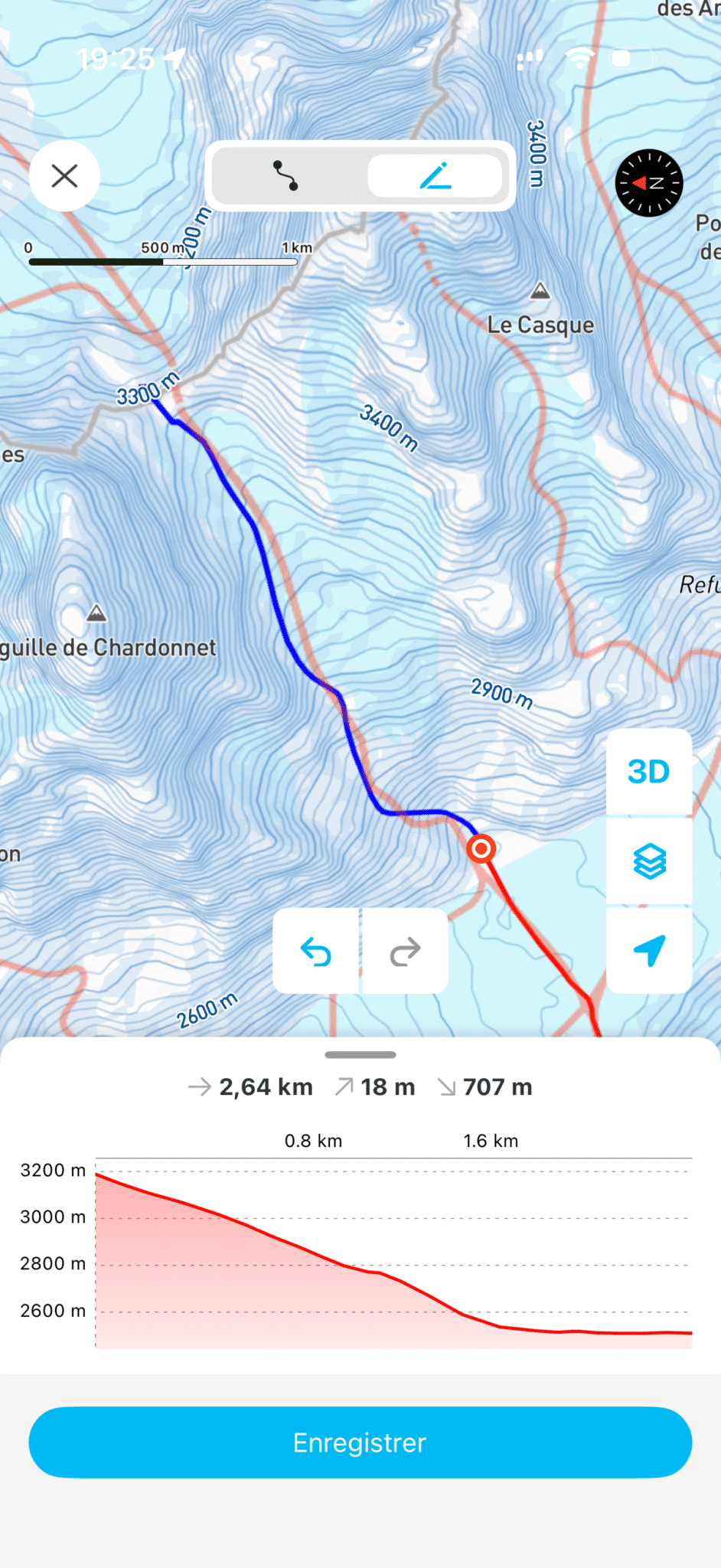 Si aucune trace GPX n'est déjà présent dans l'application pour l'itinéraire envisagé, l'app Whympr permet d'en créer une très facilement. Il y a deux manières d'utiliser cette fonctionnalité, les deux étant extrêmement simples à prendre en main. On peut soit tracer point par point ; soit tracer en laissant glisser son doigt sur l'écran. Dans les deux cas, une option de magnétisme afin de coller aux sentiers est activable ou non, et il est pratique de désactiver cette fonctionnalité pour tracer une trace hivernale qui ne collera pas au sentier de randonnée. Dans le même temps, l'application nous trace le profil altimétrique et met à jour la distance. À noter qu'il est aussi possible de tracer un GPX dans la webapp sur ordinateur ou tablette, puis de l'exporter pour l'importer dans Whympr.